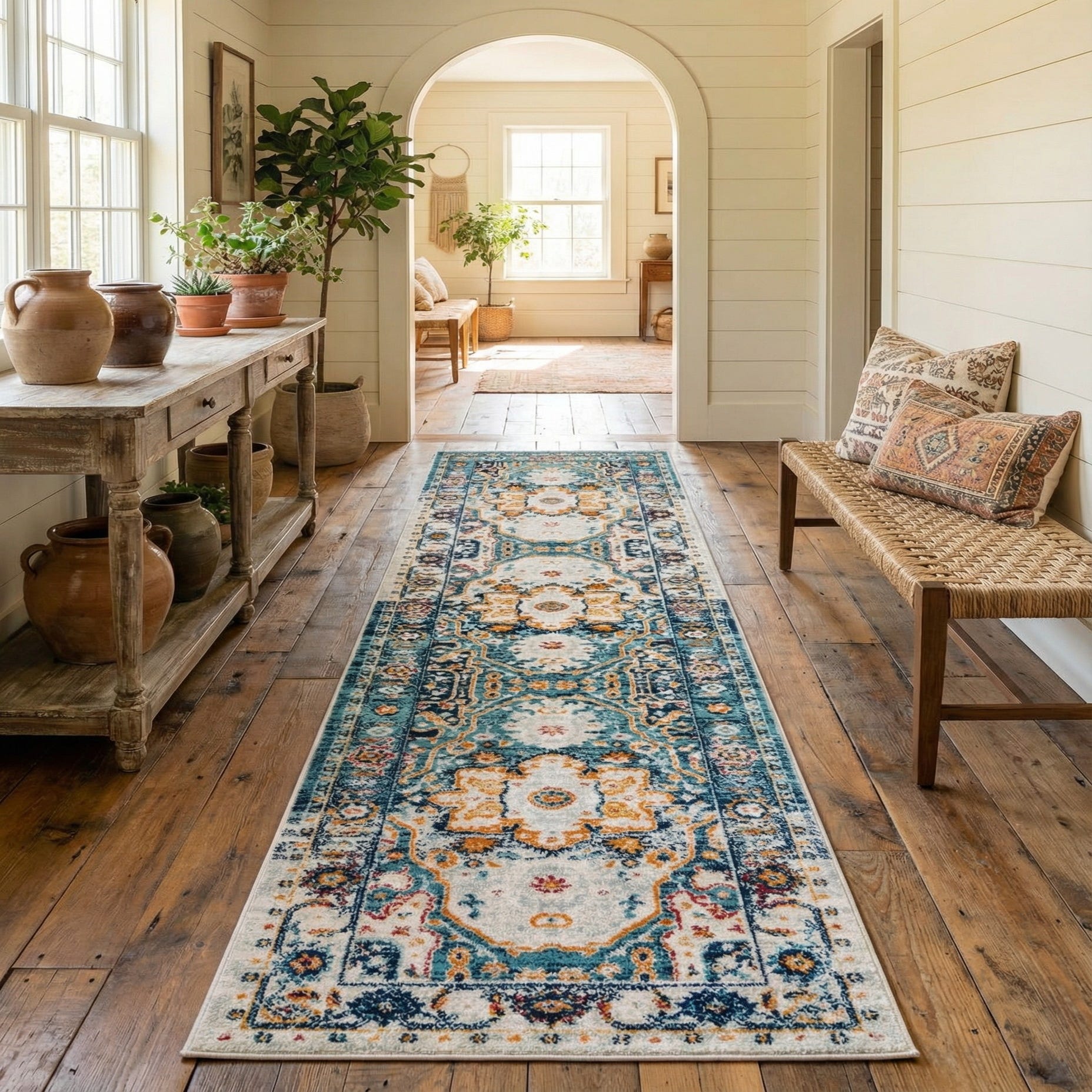 This runner works well in a hallway or entryway to bring color and traditional character to a narrow space, and it’s also a good choice in front of a console or along a kitchen aisle. Pair it with warm wood furniture, navy or gray cabinetry, and textured linens for a transitional look, or layer it into an eclectic living space with mixed patterns and bold accessories to highlight the rug’s vibrant accents.