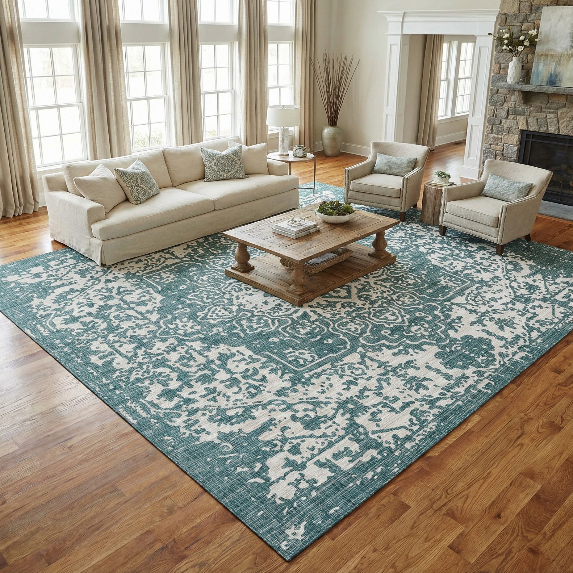 Primary color is Teal. Colors in this rug include: Teal, Ivory.