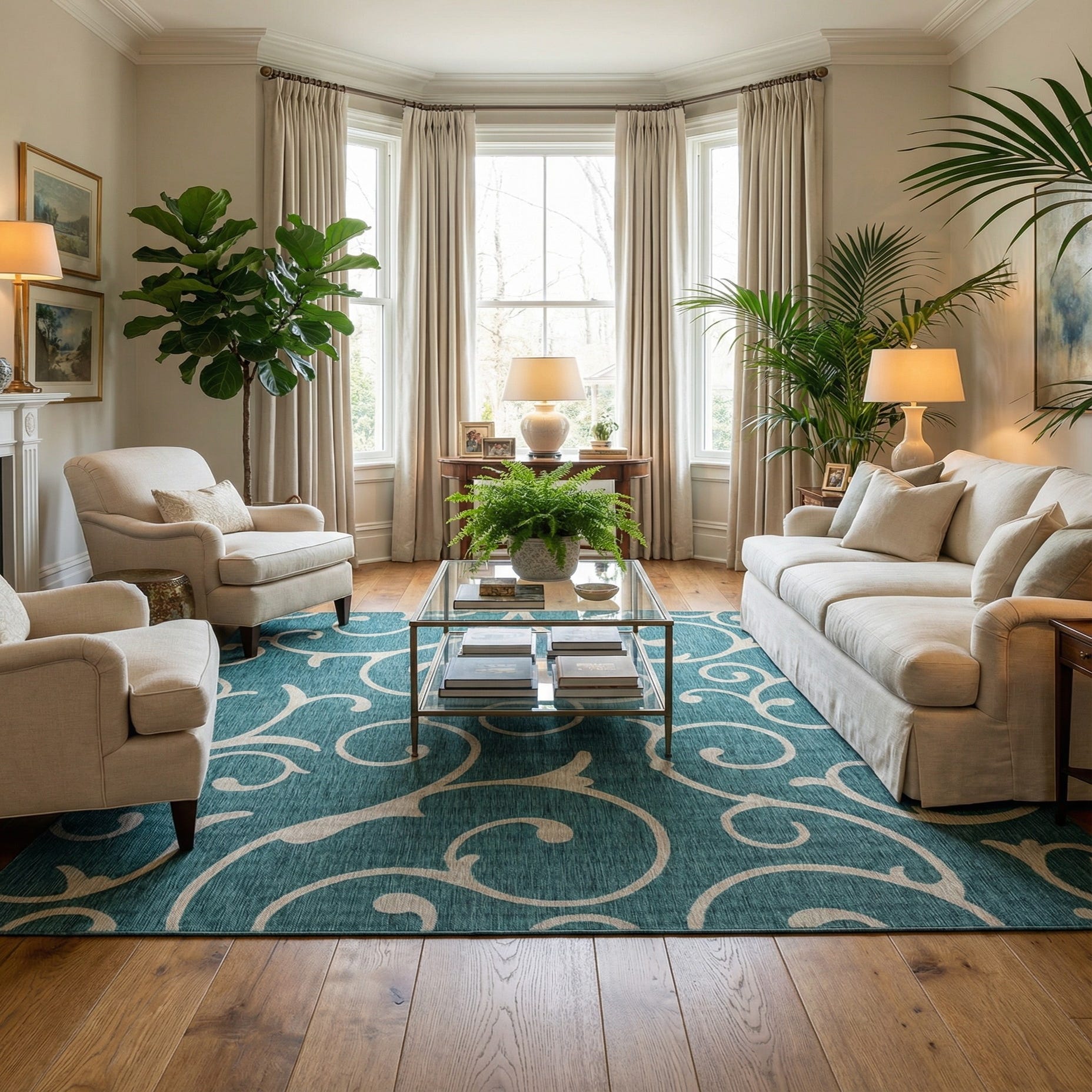 A square blue and green rug with an elegant cream botanical scroll pattern, suitable for indoor or outdoor spaces.