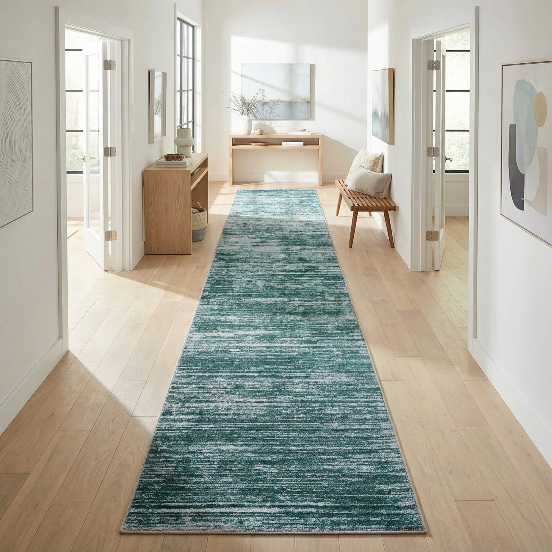 A tonal, striated pattern runs the length of this runner, with a teal ground threaded through by irregular ivory streaks that create subtle movement and depth. The design leans modern-contemporary with an organic, slightly distressed look that fits both streamlined and relaxed interiors. Teal provides a rich backdrop while the ivory highlights brighten the surface and emphasize the linear texture.