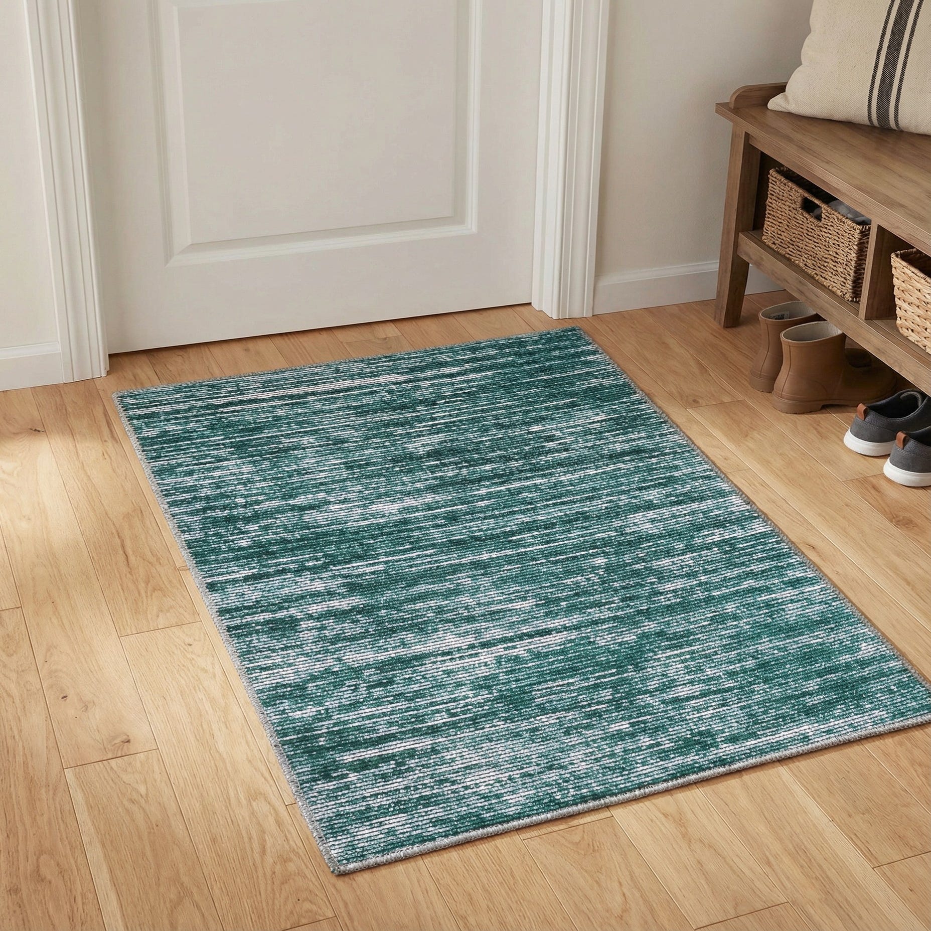 A 2x3 rectangular indoor rug featuring a modern stripe pattern in varying shades of blue and green, with a textured pile.