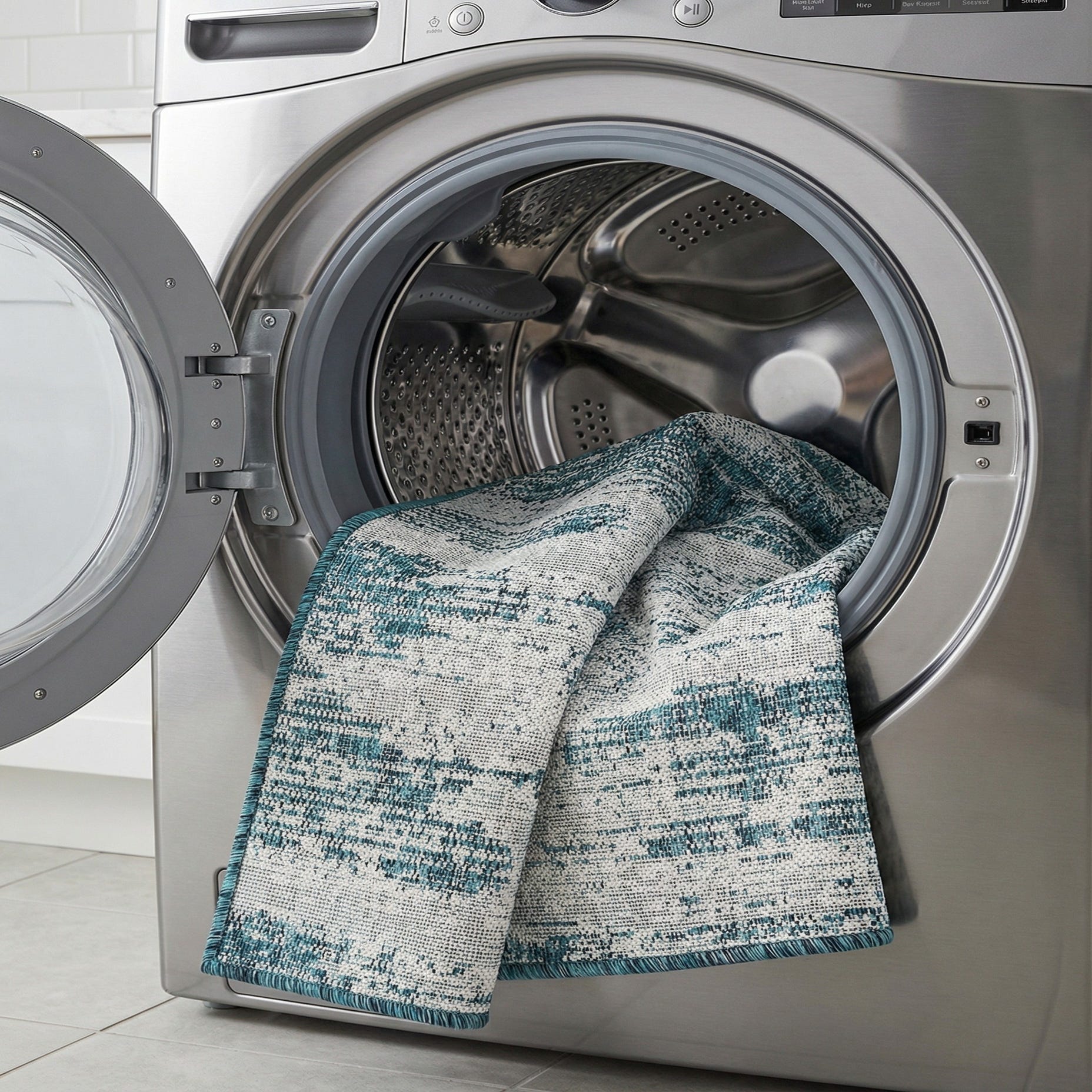 Ideal for small outdoor seating areas, balconies, or a covered patio, this piece also works well inside in a sunroom, mudroom, or kitchen where durable, low-pile performance is desired. Pair it with natural woods and woven textures for a coastal or casual contemporary setting, or let the teal provide a cool pop of color against neutral sofas and crisp white accents in a modern or mid-century inspired space.