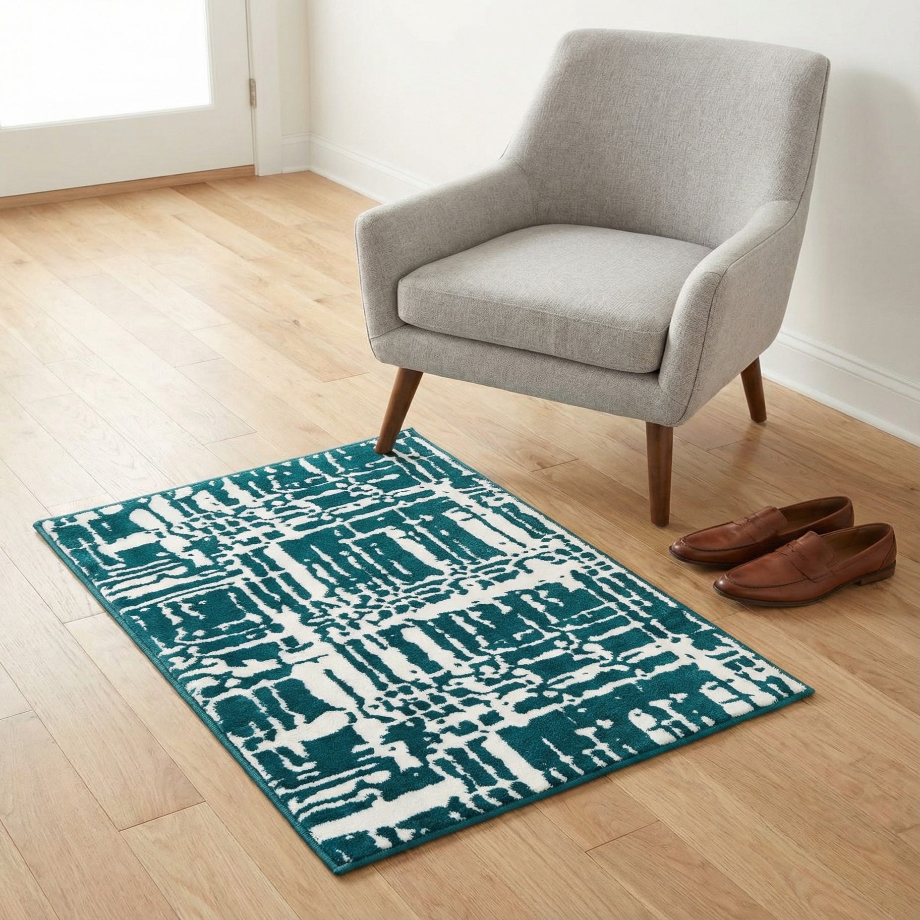 Primary color is Teal. Colors in this rug include: Teal, Ivory.