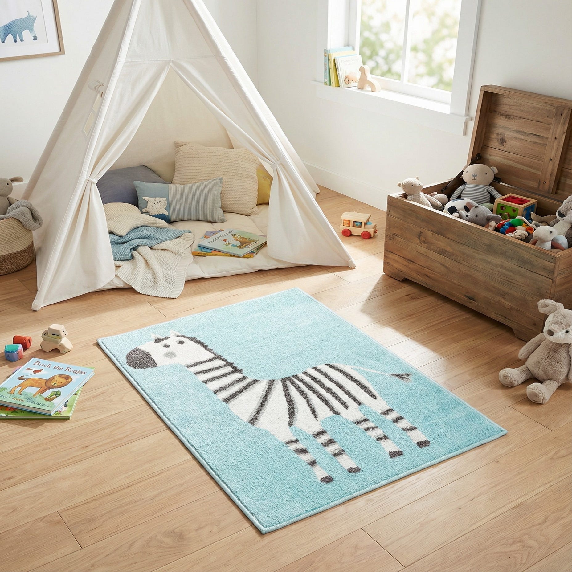 This rug works well in a nursery, playroom, or reading nook where a pop of color and a friendly design are welcome. Pair it with light wood furniture and white or gray accents for a fresh, Scandinavian-inspired look, or layer it over warm hardwood to add comfortable texture to a child’s corner. Its approachable palette of teal, black, and ivory also complements pastel accessories and coastal or contemporary décor.