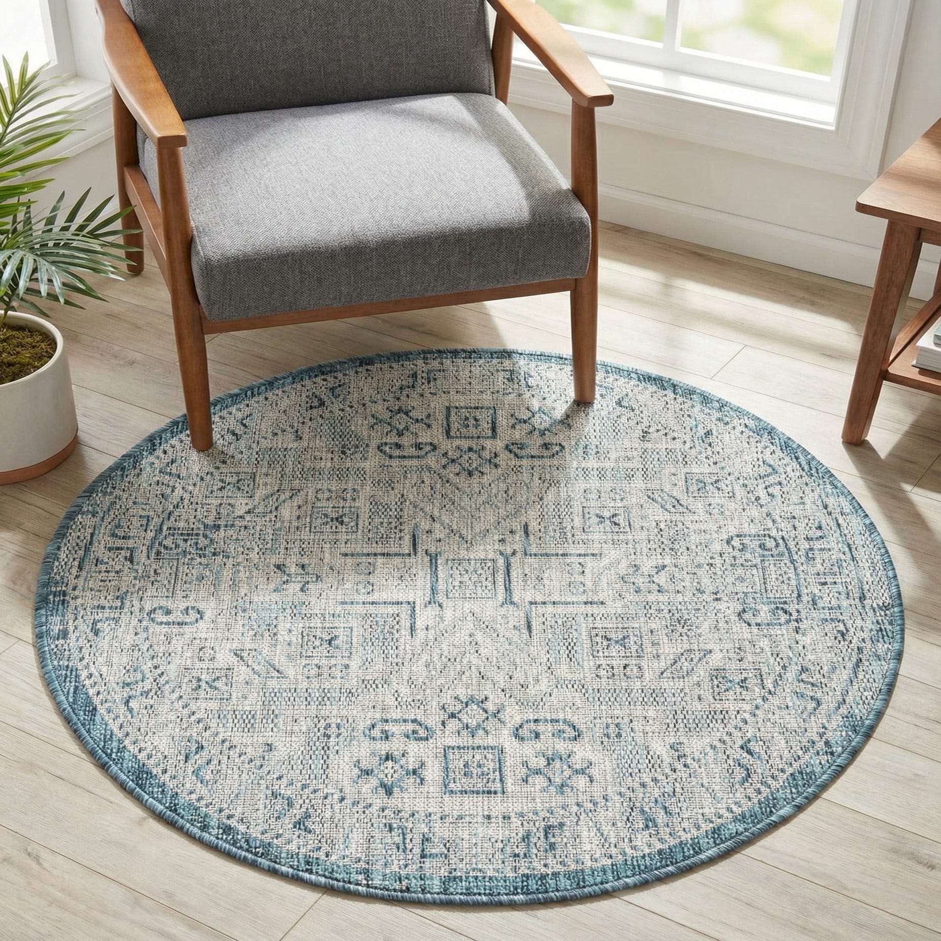 A round rug with a clear Aztec-inspired medallion at its center, this piece pairs crisp geometric motifs with a gently worn appearance. Teal provides the background field while ivory patterns create contrast through stacked diamonds, stepped chevrons and small star-like accents. The design is rendered in a low-profile, flatwoven texture that shows the weave structure up close—running your hand across it reveals a tightly packed polypropylene construction with a subtle, pleasantly tactile grain.