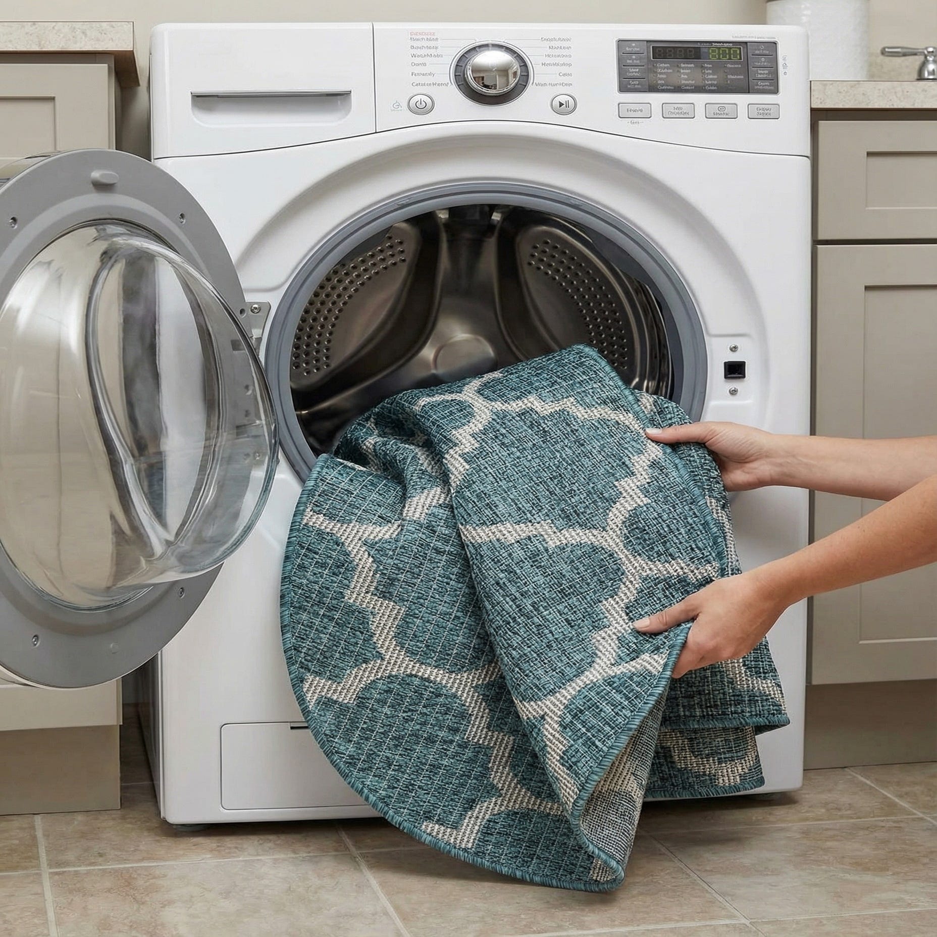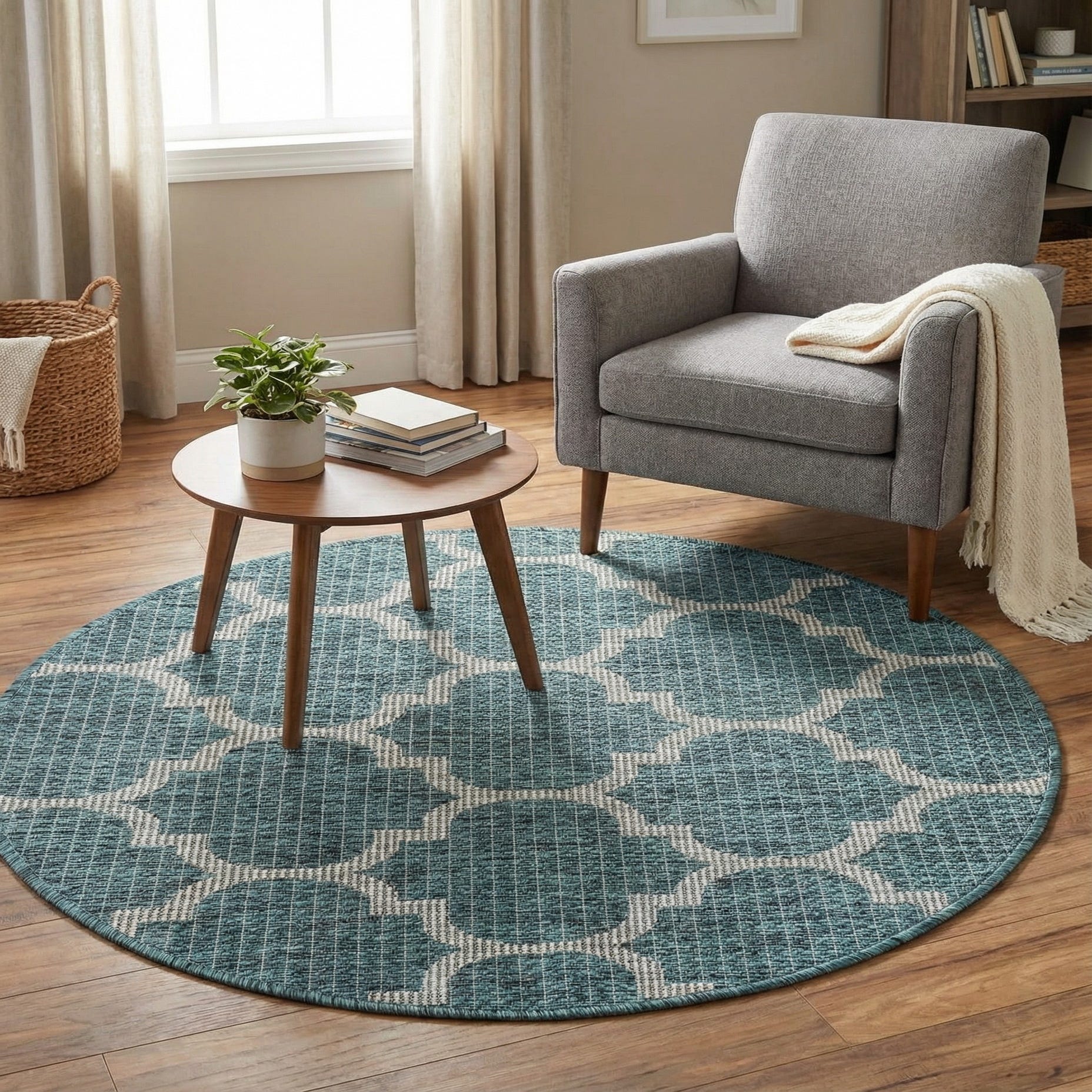 Use this round rug to anchor a bistro set on a covered patio, to warm a sunroom under a pair of wicker chairs, or to add a pop of color in a compact entry or reading nook. It pairs naturally with warm wood tones, neutral linen upholstery, and metallic accents, and complements palettes that include navy, cream or coral for a fresh coastal or transitional look.