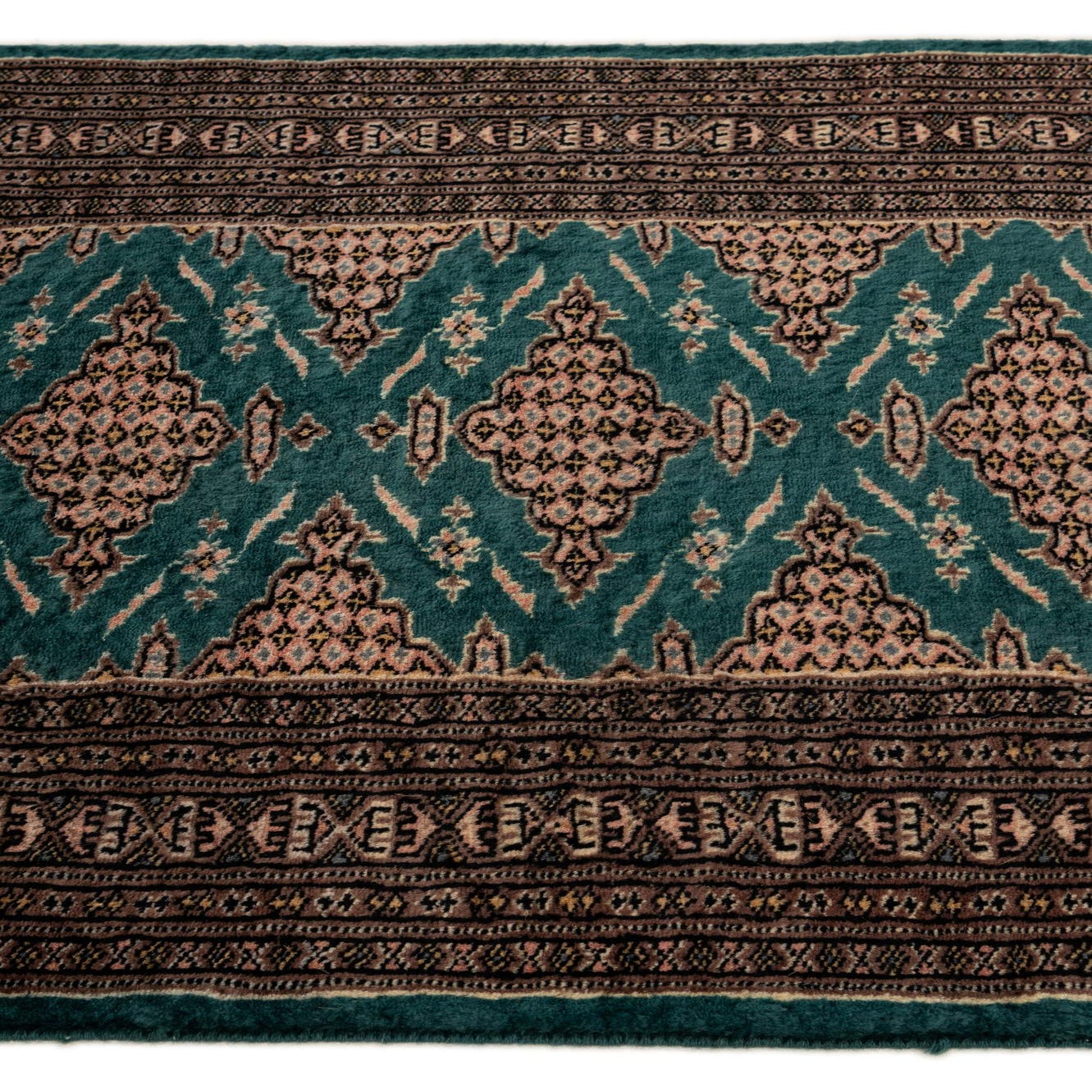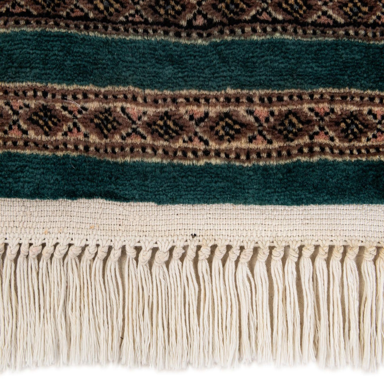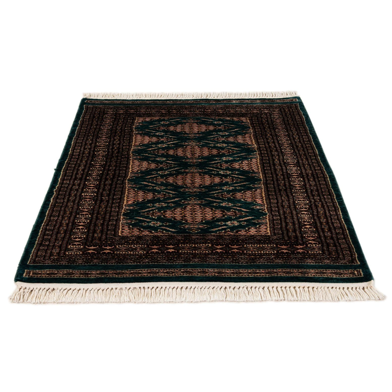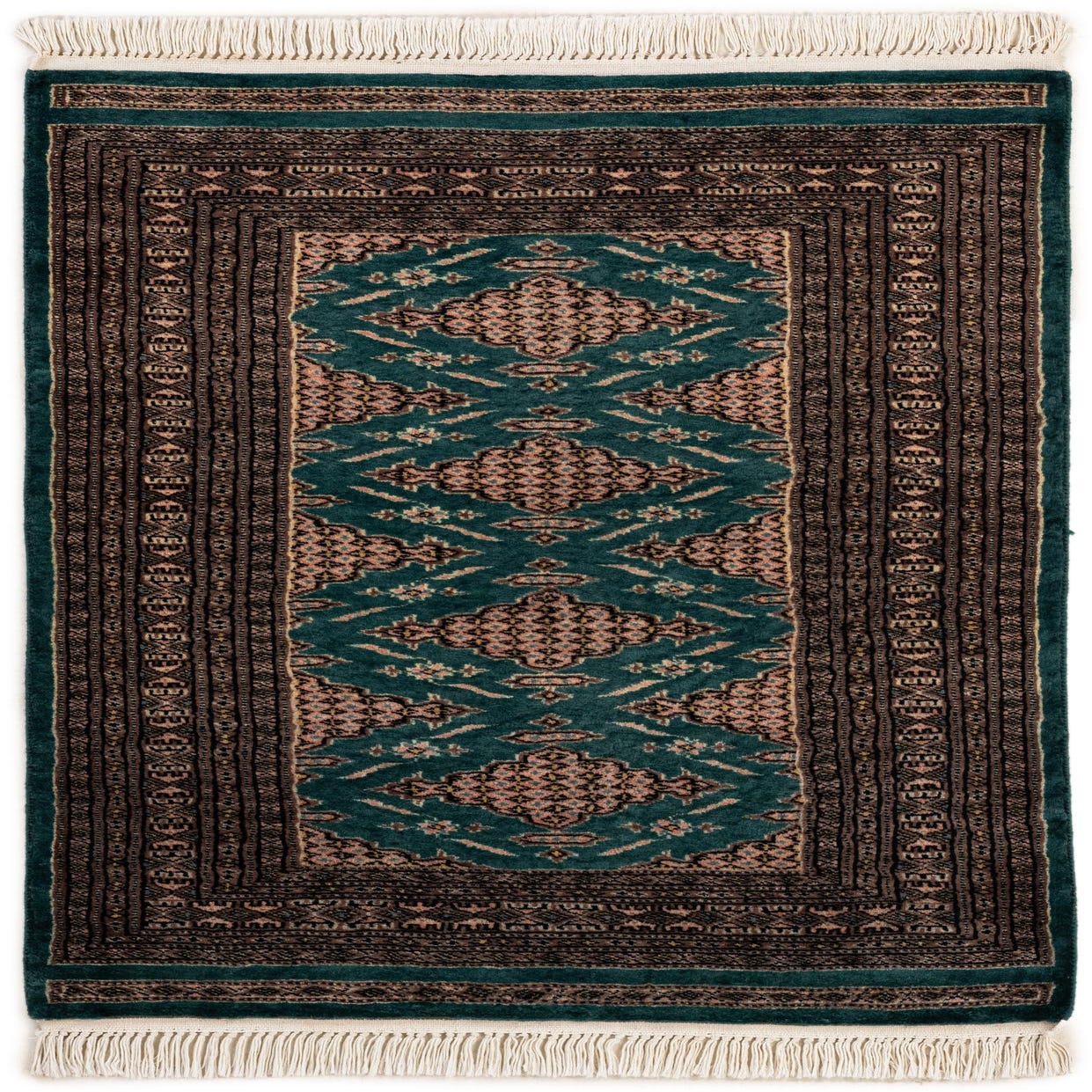 A 3x4 rectangular Bokhara rug featuring a teal green field with peach and dark brown tribal patterns, bordered by dark brown and white fringes.