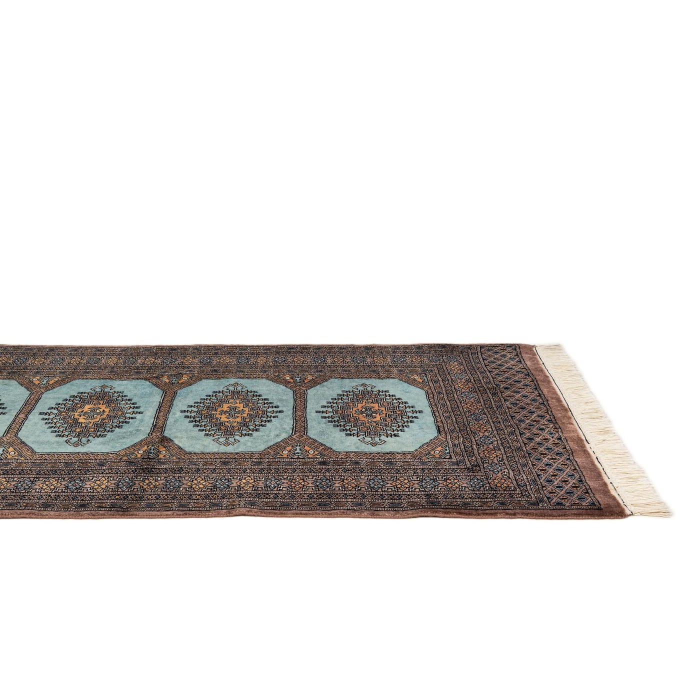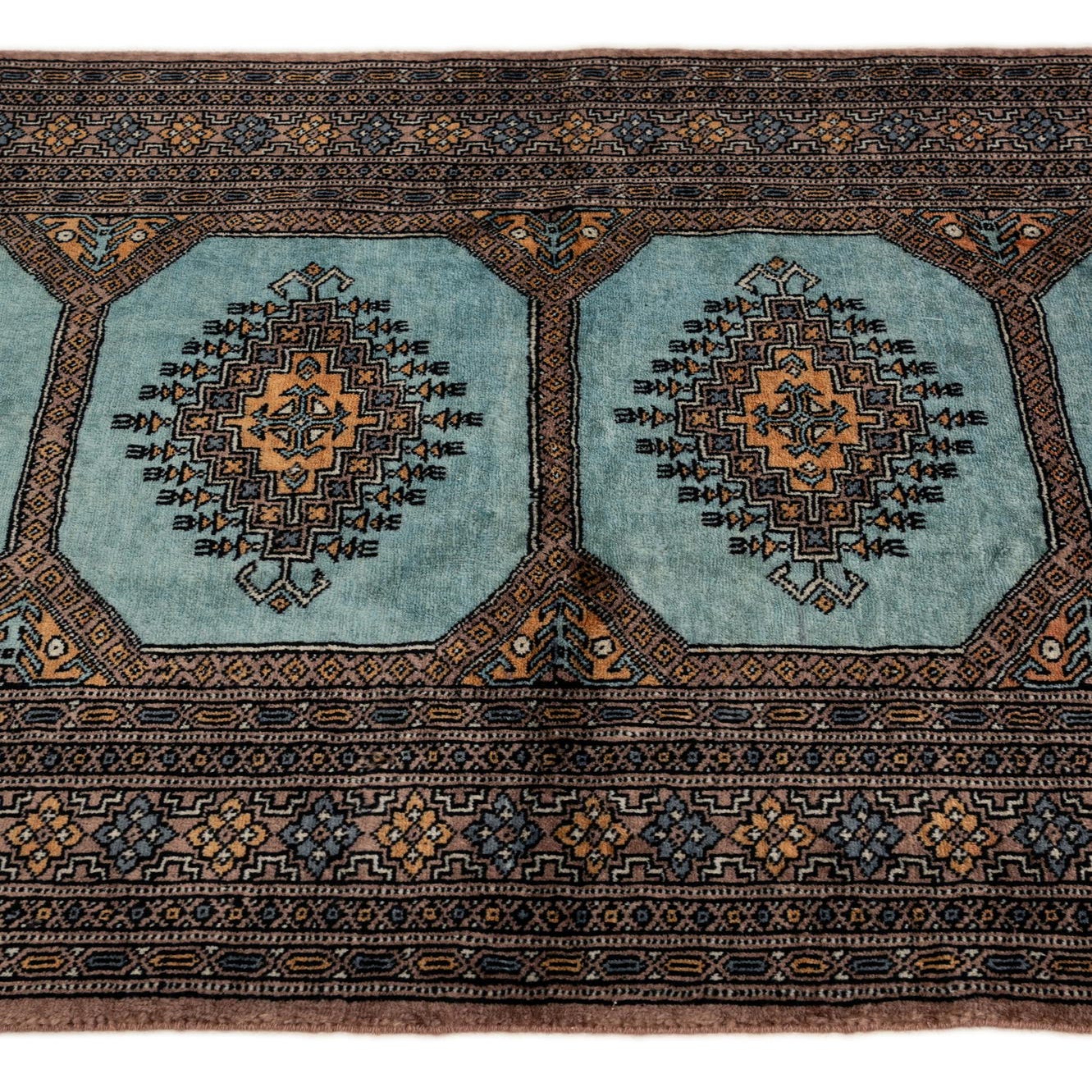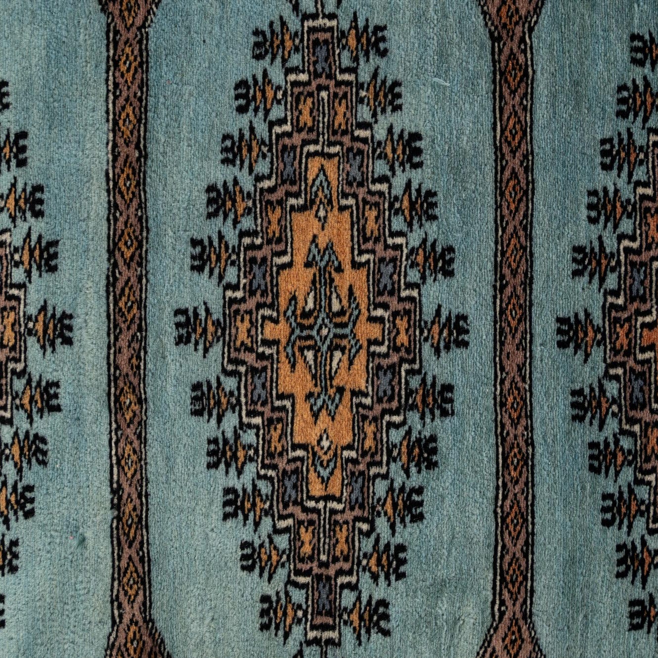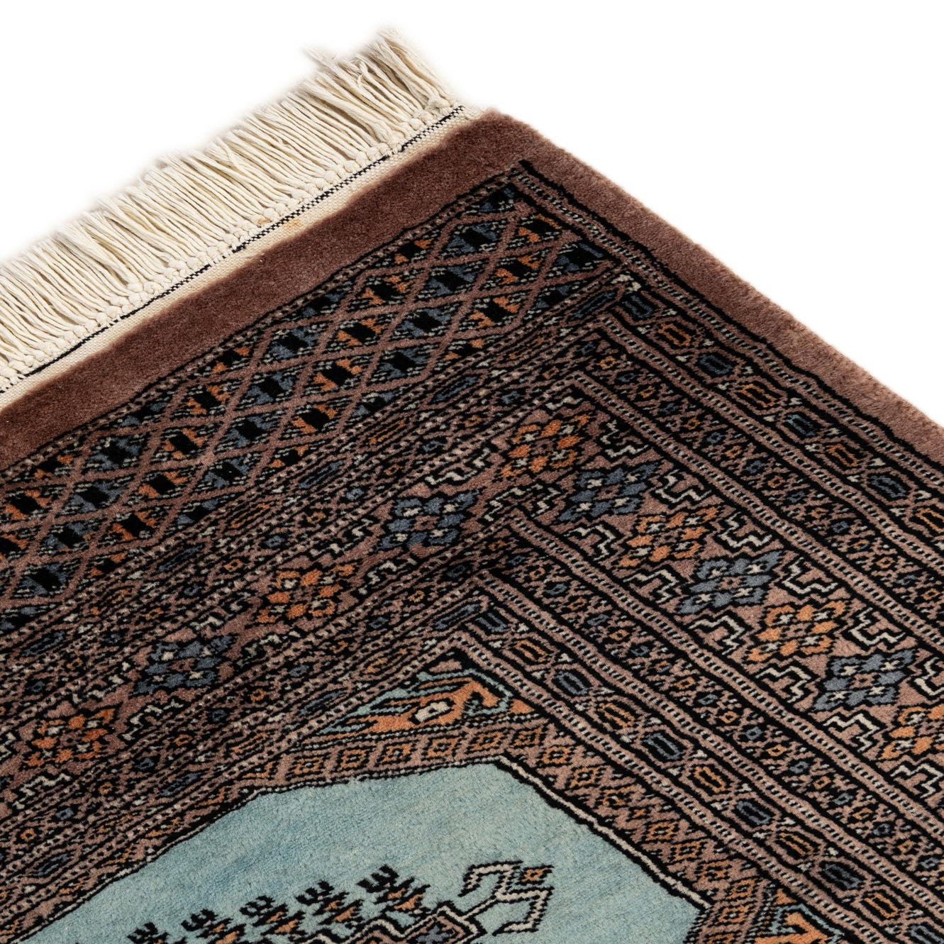 A 3x5 rectangular Bokhara rug featuring a tribal pattern in blues, greens, and browns, with central medallions.
