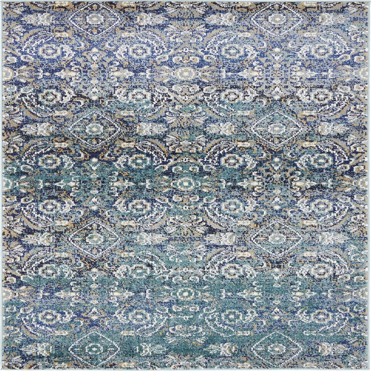 Primary color is Teal. Colors in this rug include: Teal, Black, Blue, Green, Ivory, Tan.