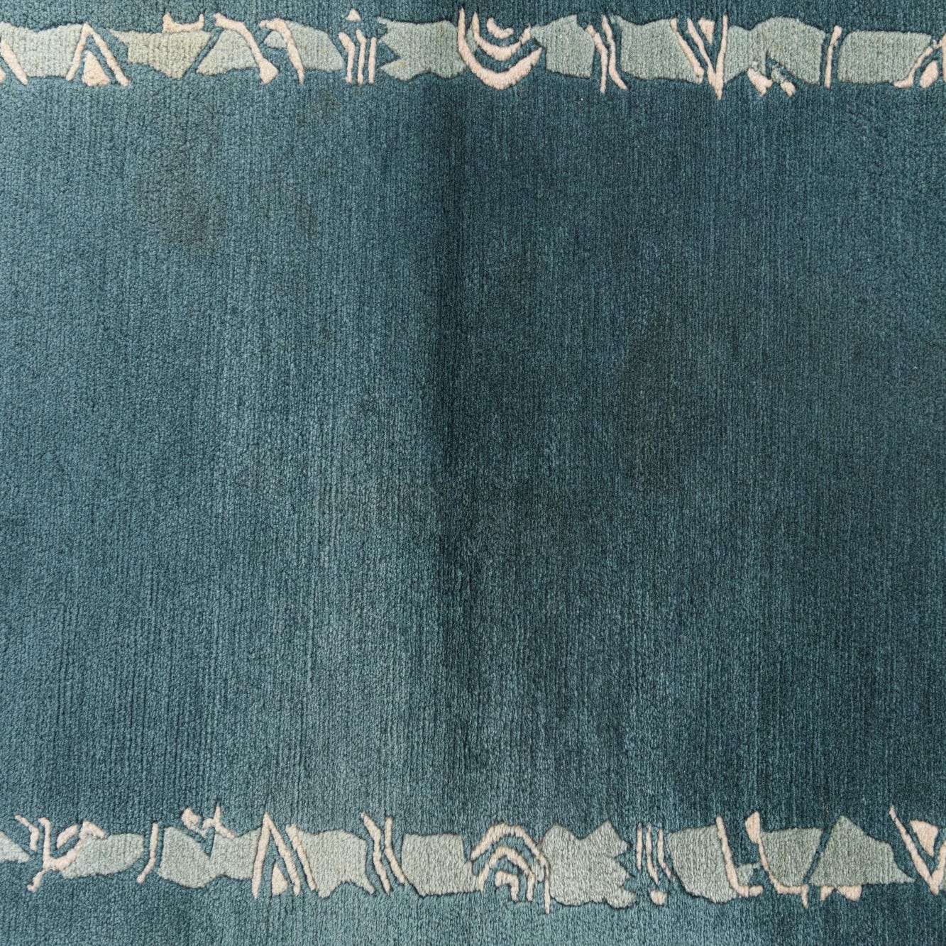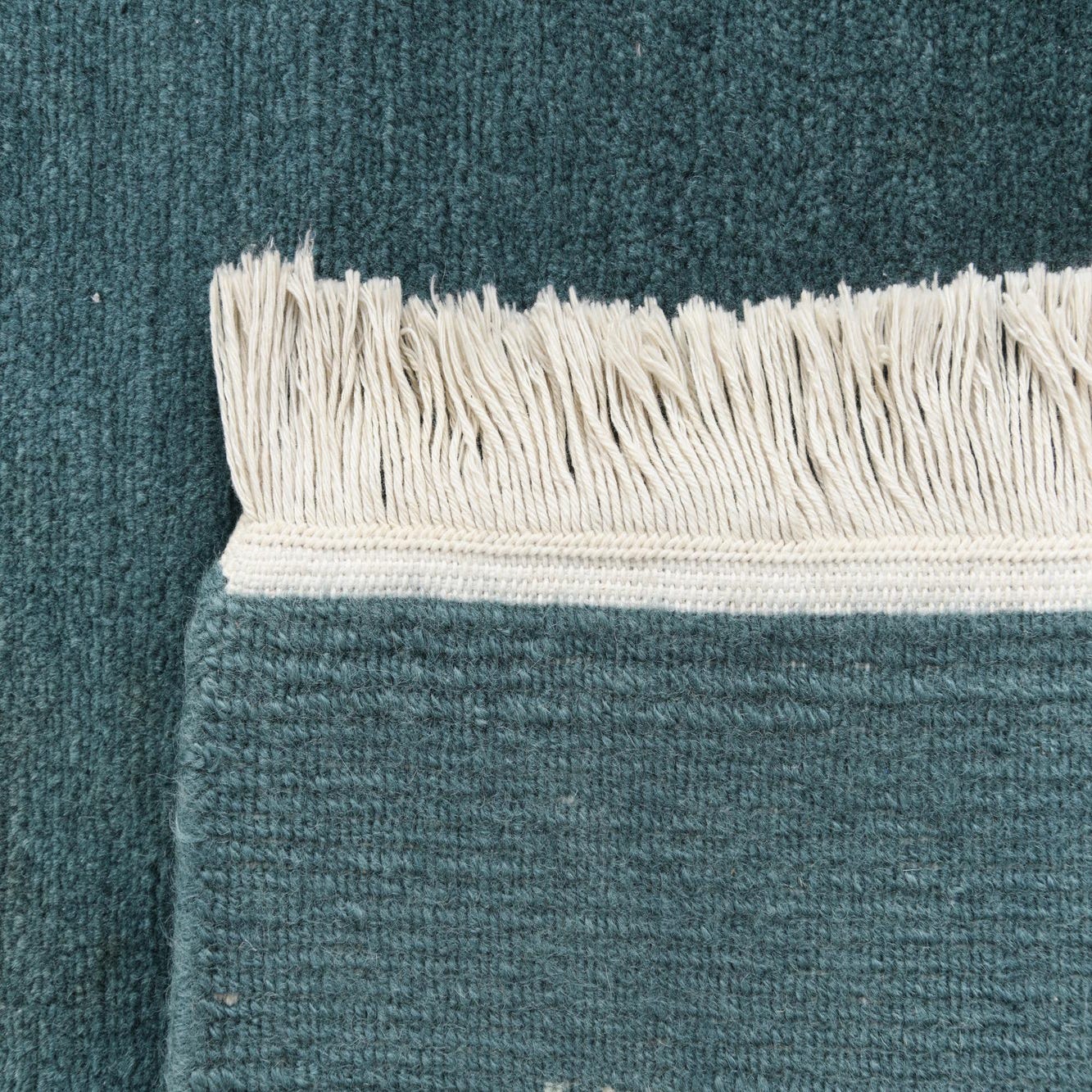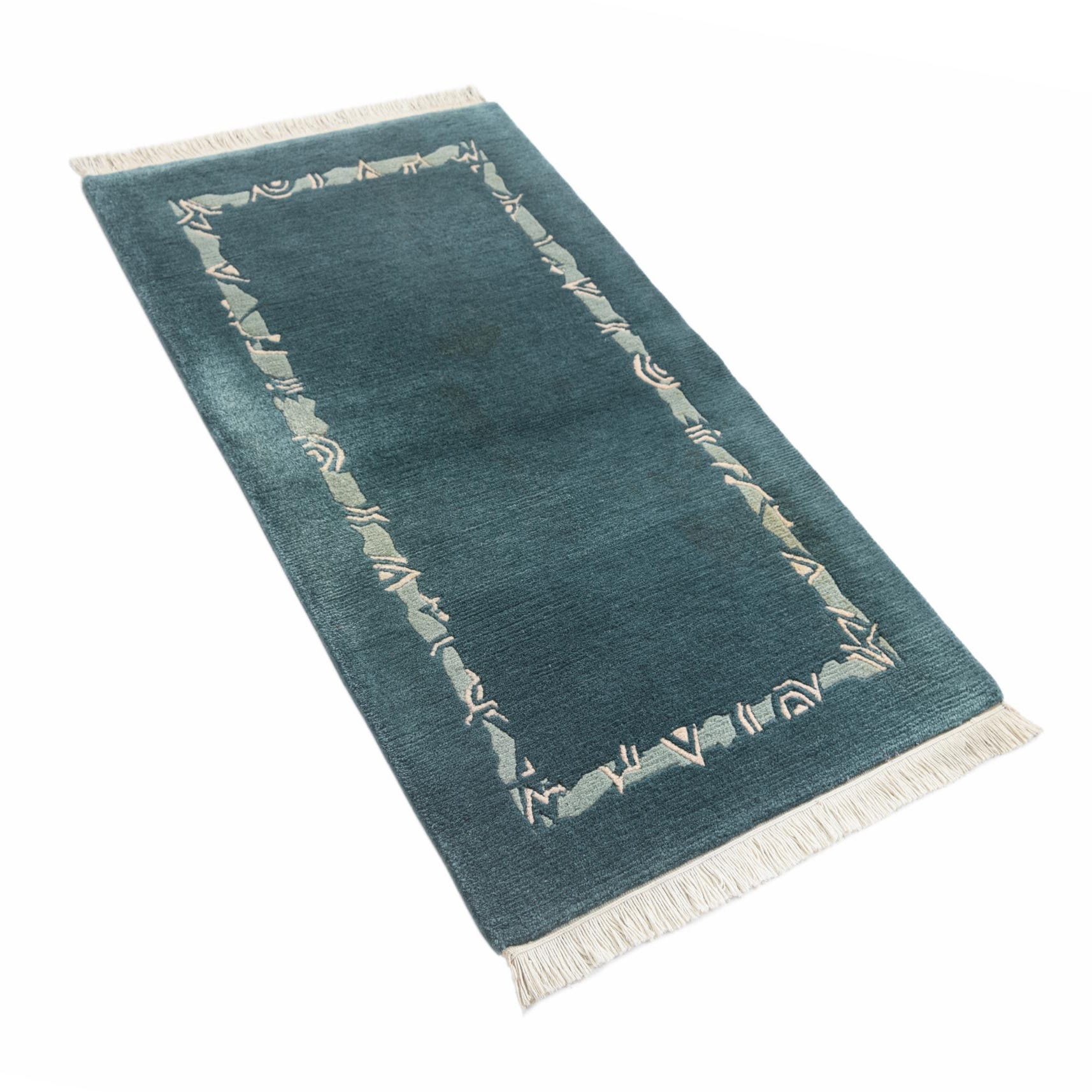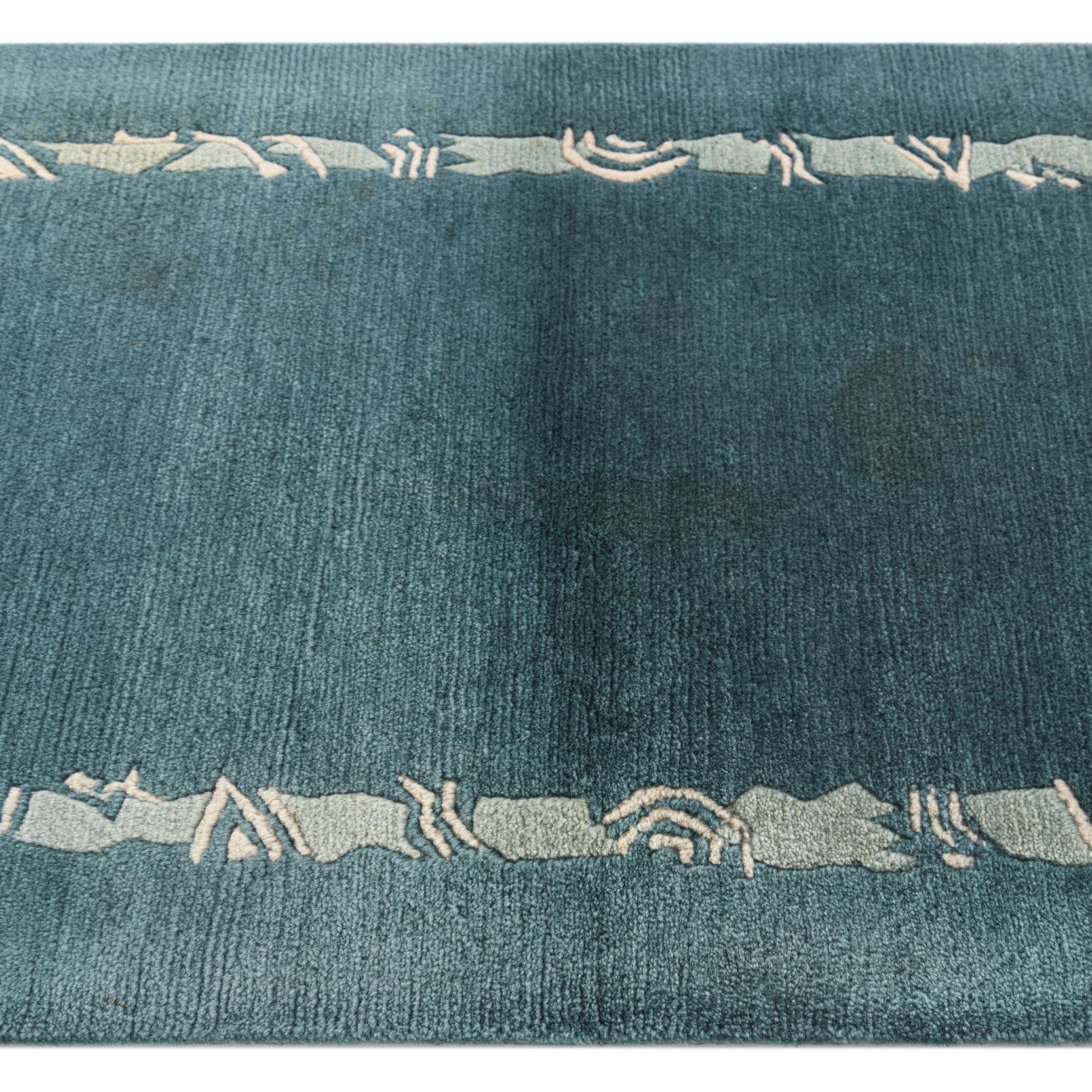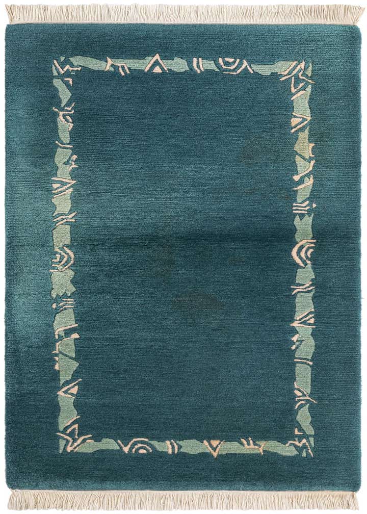 The Nepal Collection presents a refined 3x5 hand-knotted rug crafted from 100% wool, offering both durability and a soft, plush texture underfoot. This piece is distinguished by its rich teal background, which provides a deep and inviting canvas for the subtly contrasting light green and light brown tribal-inspired patterns that adorn its border. These geometric motifs add a touch of authenticity and visual interest without overwhelming the rug's elegant simplicity.