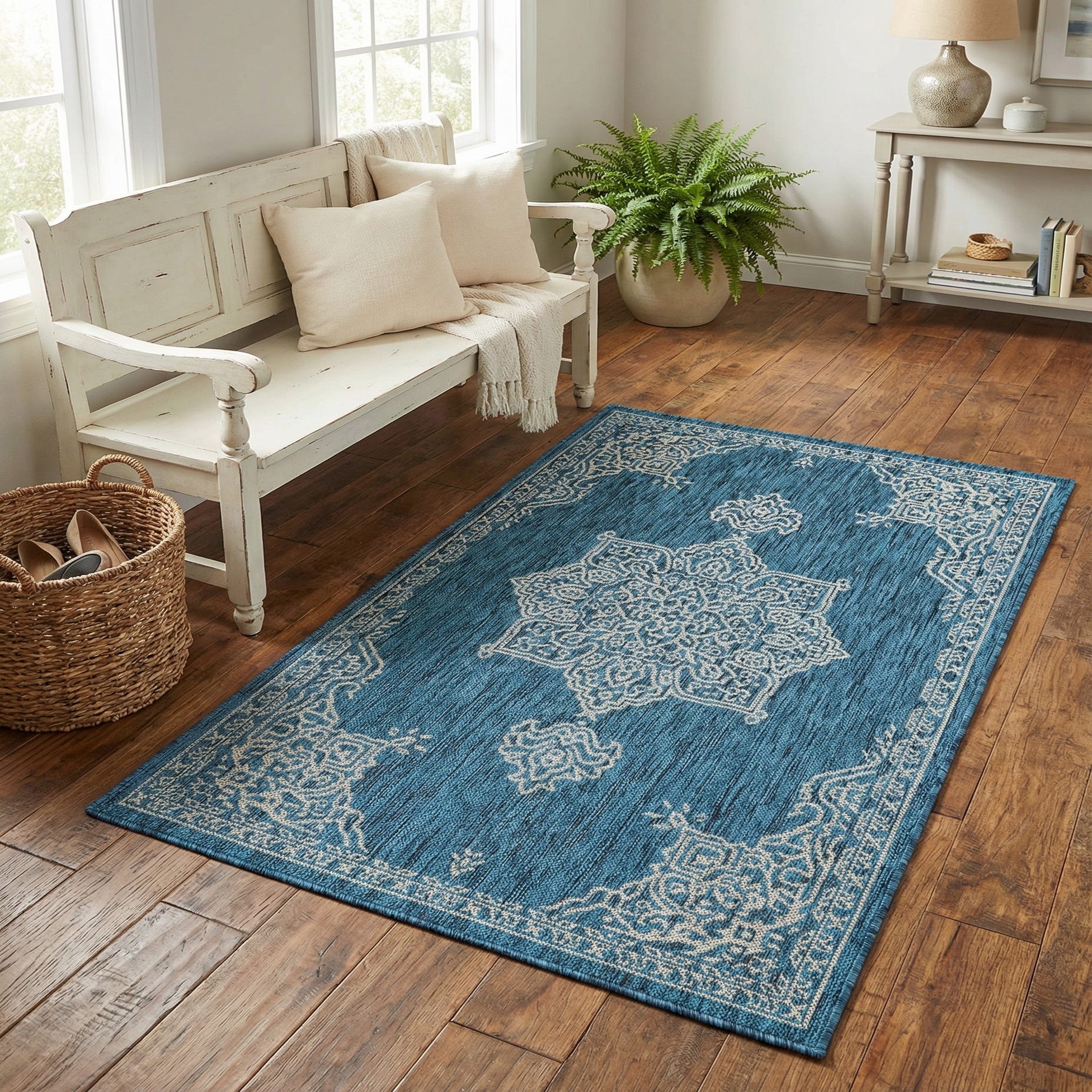 Place this rug where its color can anchor a compact seating area—on a covered patio, in a sunroom, or beneath a small dining or bistro set. It pairs naturally with light woods, rattan, or painted furniture in white or charcoal, and complements coastal, transitional, or traditional interiors that welcome a bold teal accent.