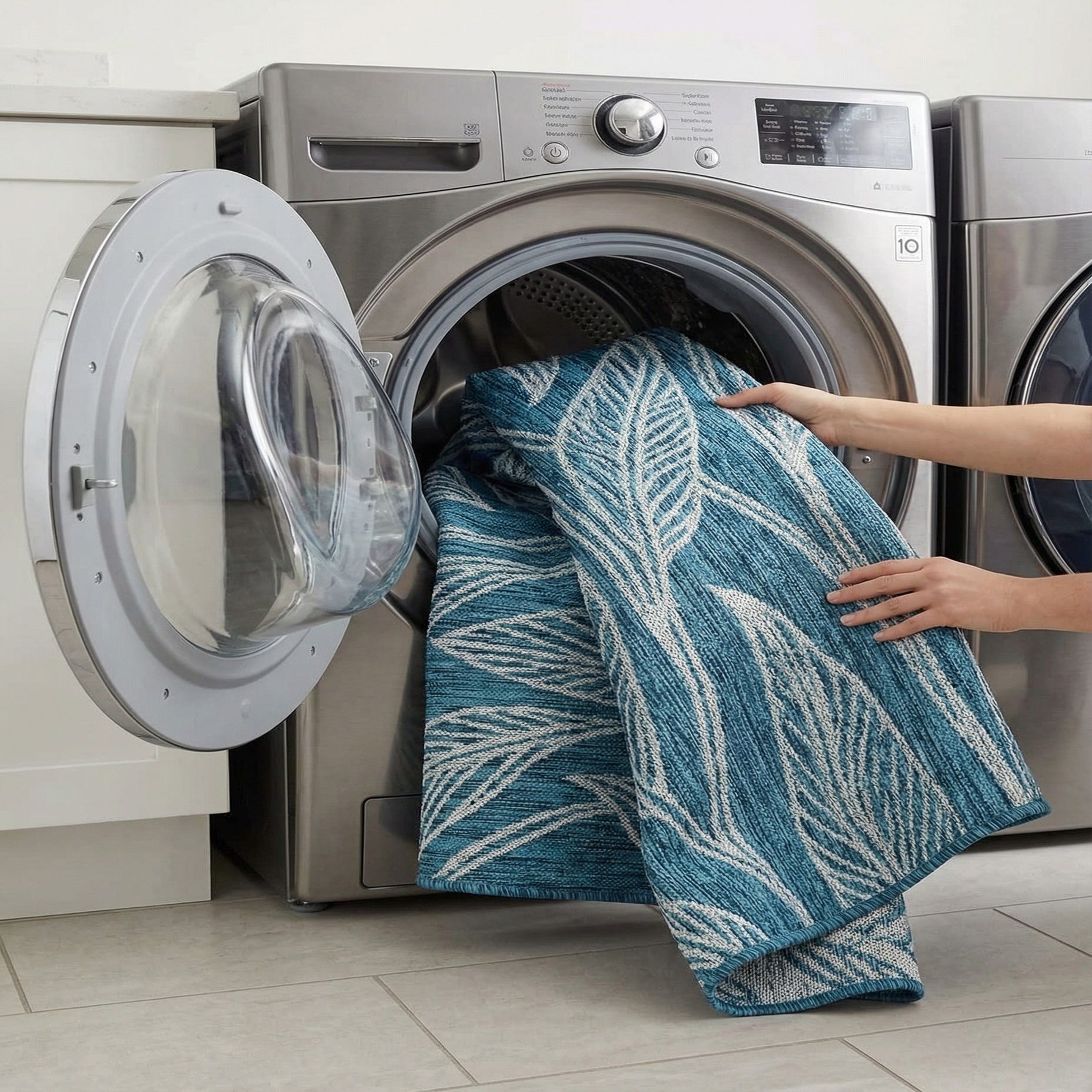 This round design works especially well on a covered porch or sunroom where the teal brings a fresh, coastal energy, and pairs naturally with wicker seating, teak accents, or weathered gray planters. It also complements a breezy indoor dining nook or a casual living area—place it under a small round bistro table, in front of a console, or layered atop a neutral outdoor carpet to add color and pattern without overwhelming the space.