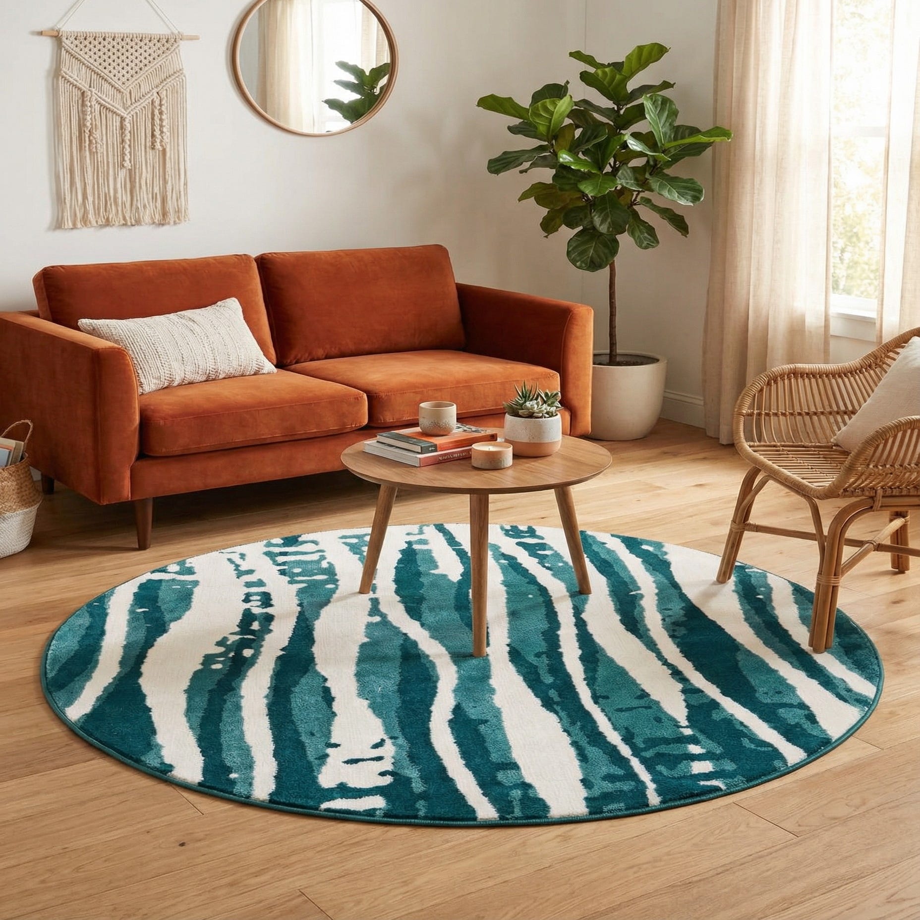 A round rug with a painterly, vertical stripe pattern that pairs organic movement with graphic contrast. A teal background sets the stage while ivory bands cut through the field and deeper hunter green accents add depth and definition. The stripes have an irregular, hand-painted quality that keeps the pattern feeling fresh and modern rather than strictly symmetrical.