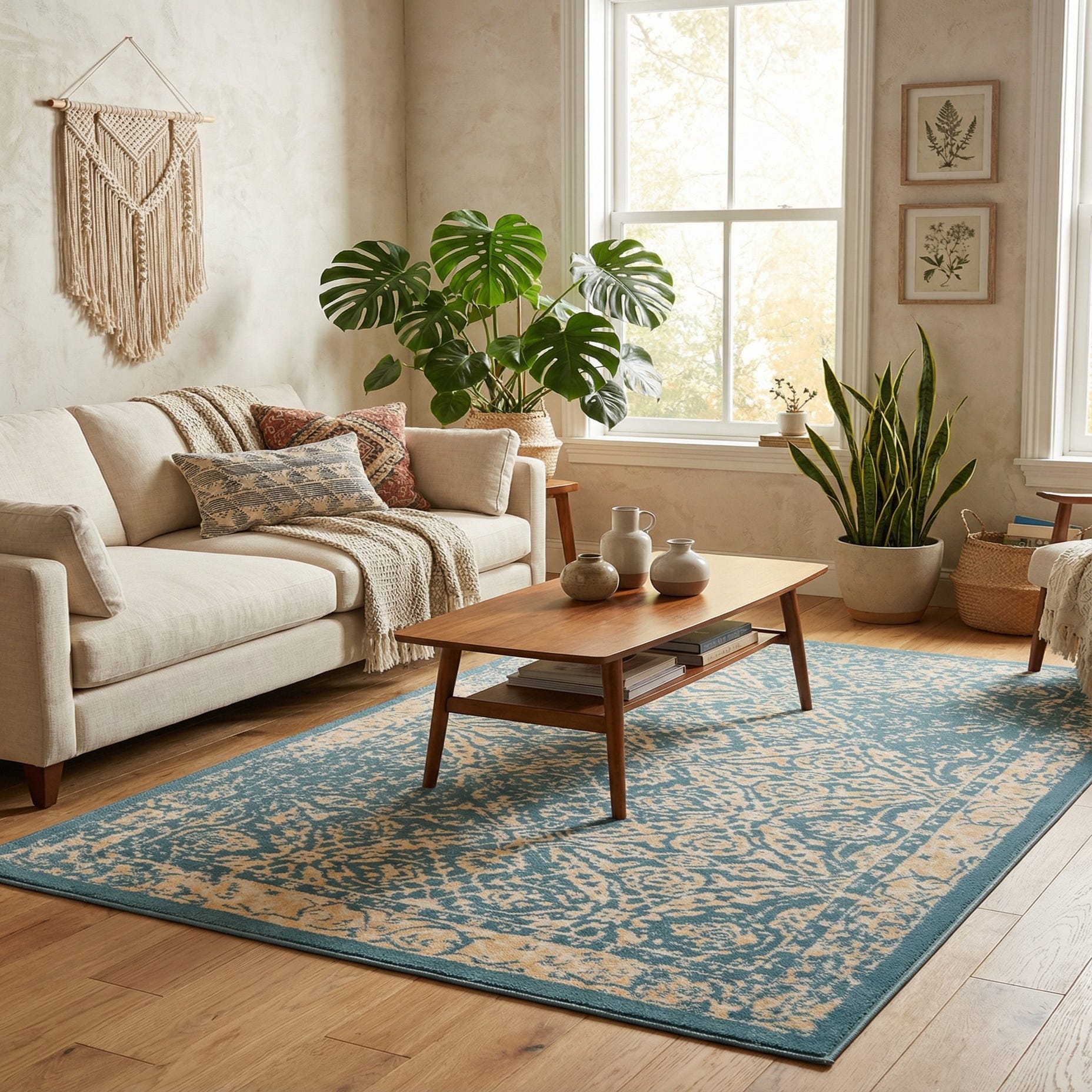 Woven from 100% polypropylene, the rug has a low, dense pile that feels smooth and slightly cushioned underfoot, with a surface that holds the pattern’s tonal shifts. Place it beneath a coffee table in a living room, layer it at the foot of a bed to add color and texture, or set it under a dining table in a casual dining area. It pairs well with warm wood tones, cream or light-gray upholstery, and metal accents—brass for warmth or matte black for contrast—to create a relaxed, stylistically mixed interior.