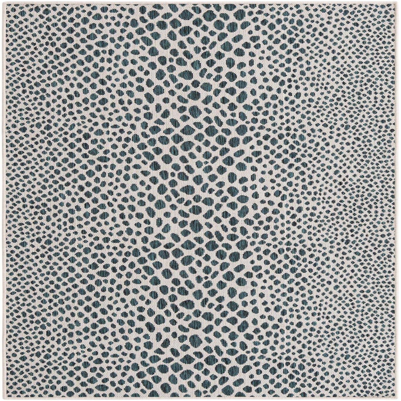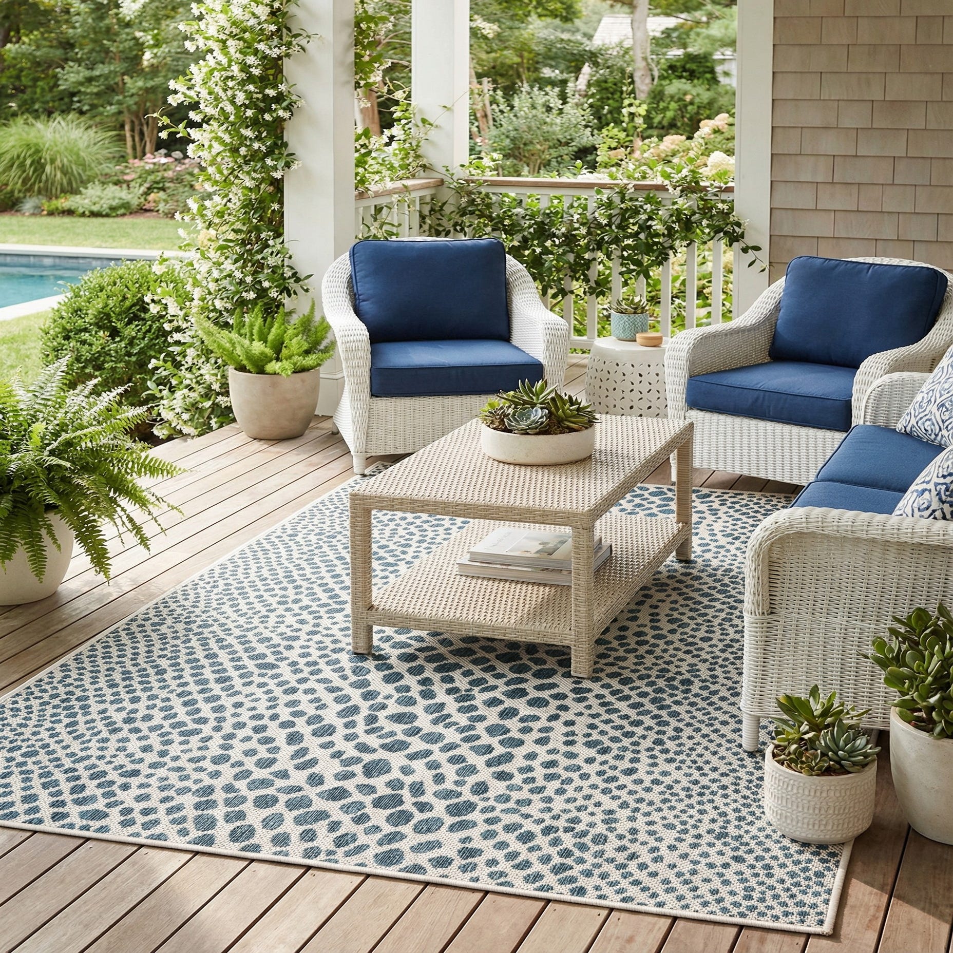 A 4x6 rectangular indoor/outdoor rug with a modern blue and green abstract spotted pattern on a light background.