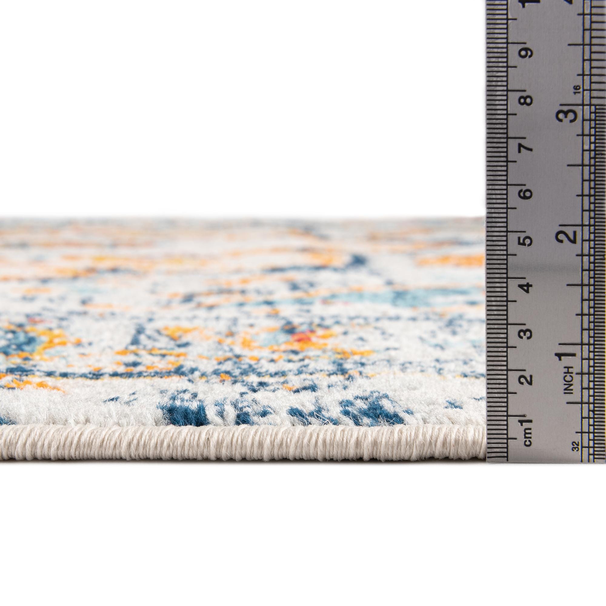 A classic medallion layout meets a gently distressed finish in this machine-made polypropylene rug. The teal background sets a vivid stage for an ivory central medallion and layered border, while accents of navy blue, red and rust red add depth and contrast against soft gray highlights. Intricate floral and arabesque motifs are rendered with a slightly worn effect that gives the pattern a lived-in, vintage character without feeling ornate. The surface has a low to medium pile with a smooth, even hand; it reads soft underfoot with a subtle texture that shows the design clearly.