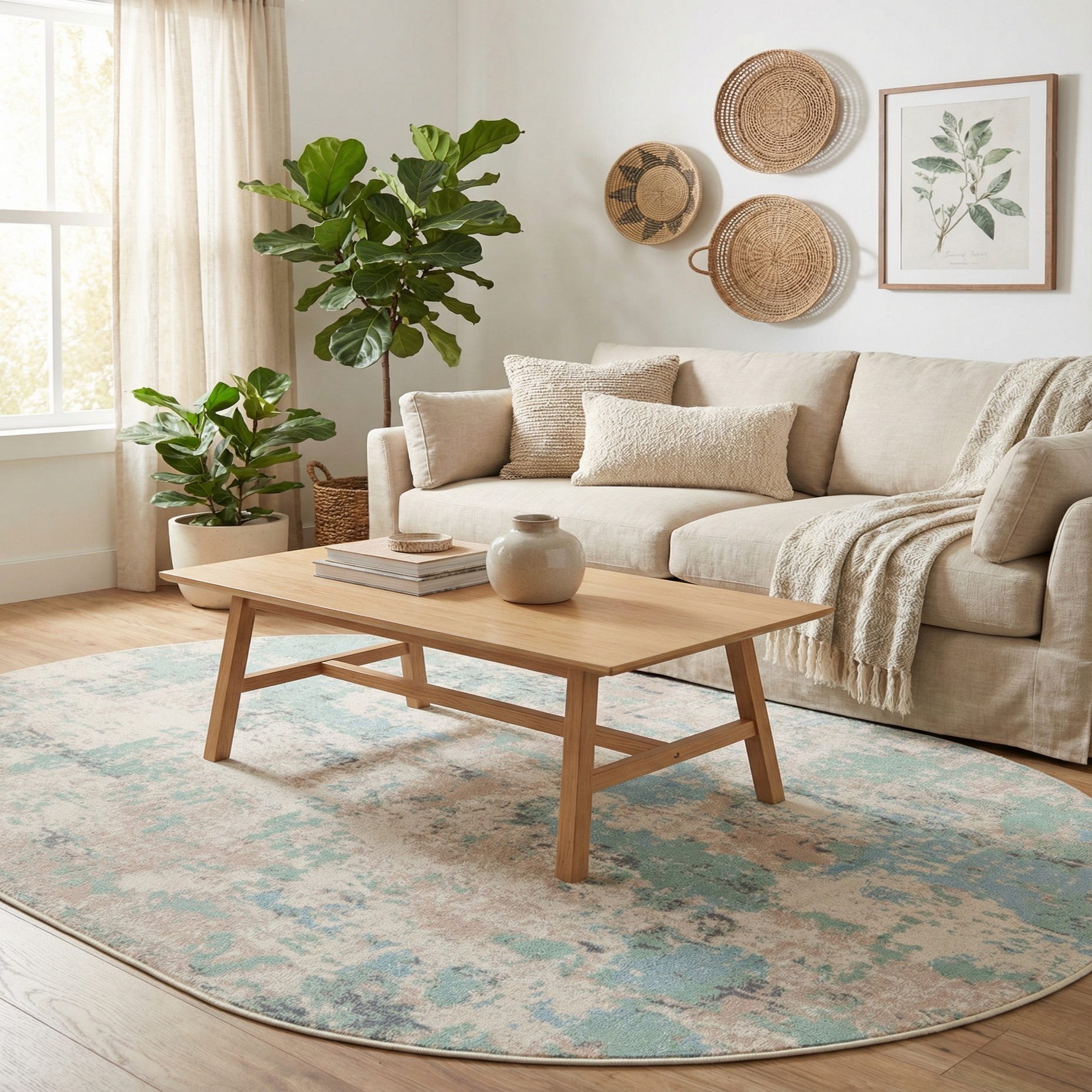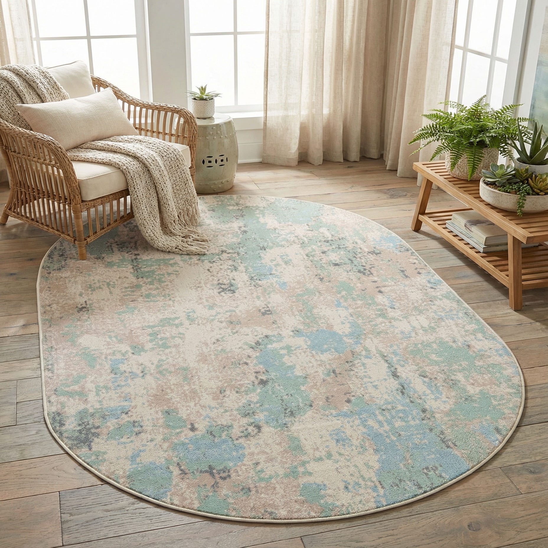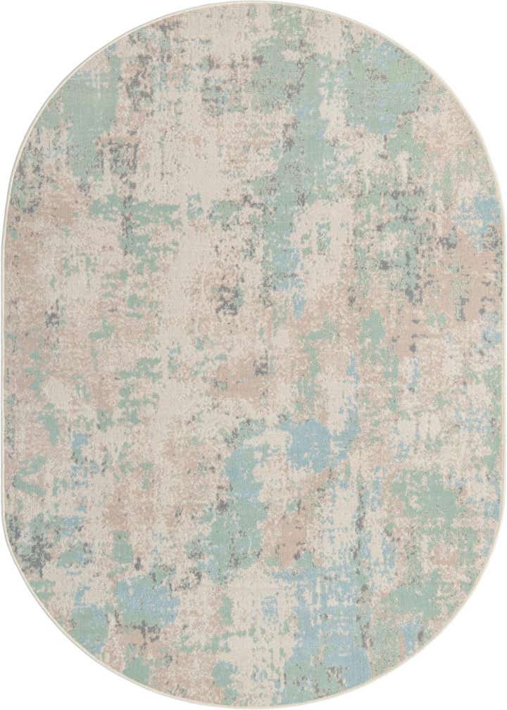 With its flatweave construction, the rug maintains a smooth and low-profile texture, suitable for high-traffic areas and under furniture. The palette and design make this rug versatile enough to elevate spaces with both contemporary and transitional decor. It can serve as a serene focal point in a minimalist setting, enhance the modernity of a home office, or add a touch of elegance to a bedroom. The tranquil color scheme allows for an easy integration into existing color schemes, while the unique oval shape adds an element of visual interest to the floor space.