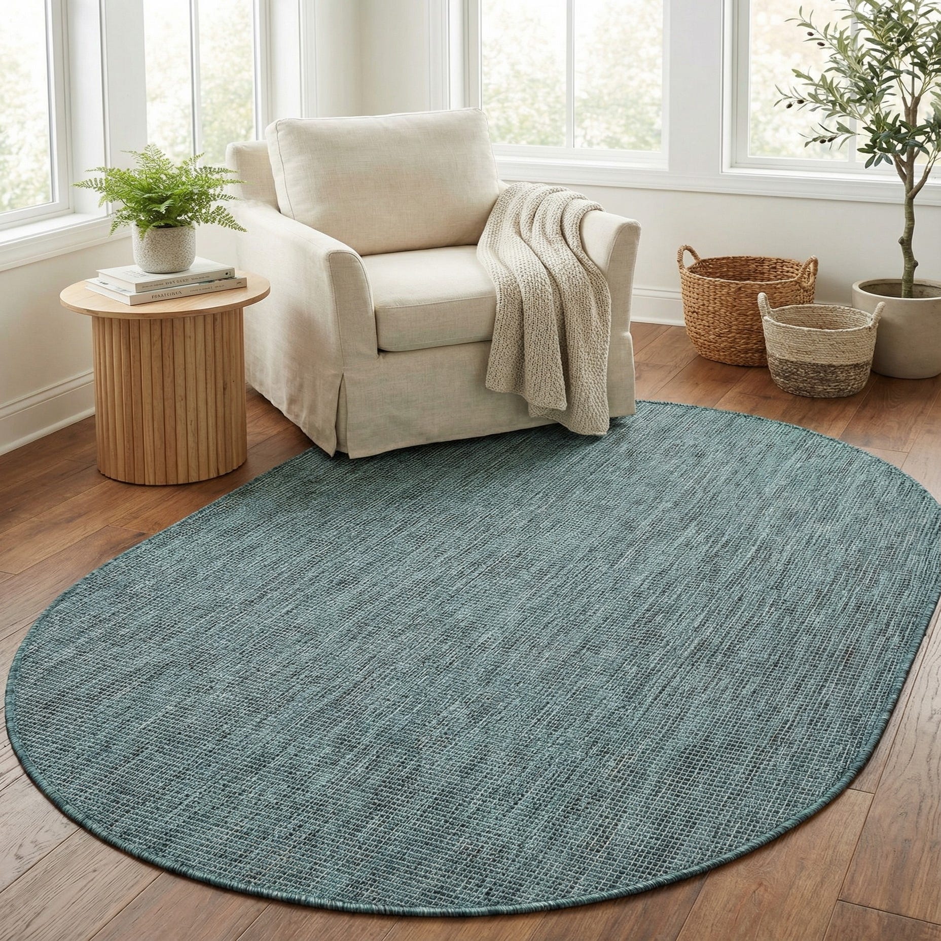 A 4'1" x 6'1" oval blue and green flatweave rug with a modern, solid textured pattern, suitable for indoor or outdoor use.