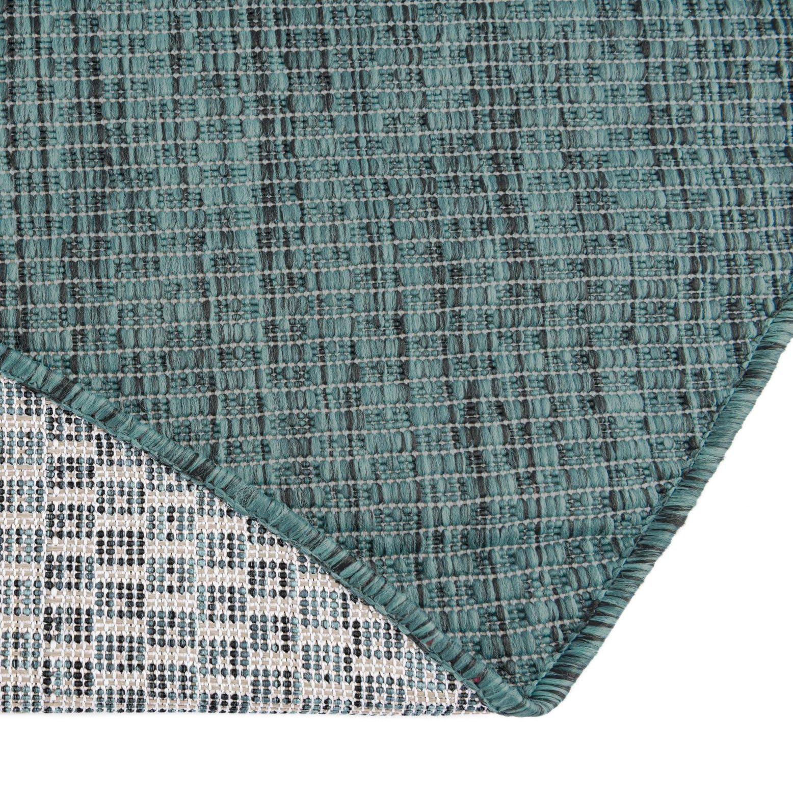 Primary color is Teal. Colors in this rug include: Teal, Black.