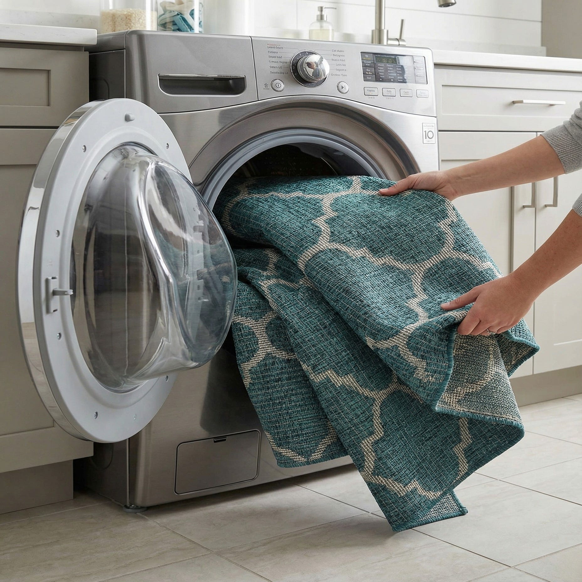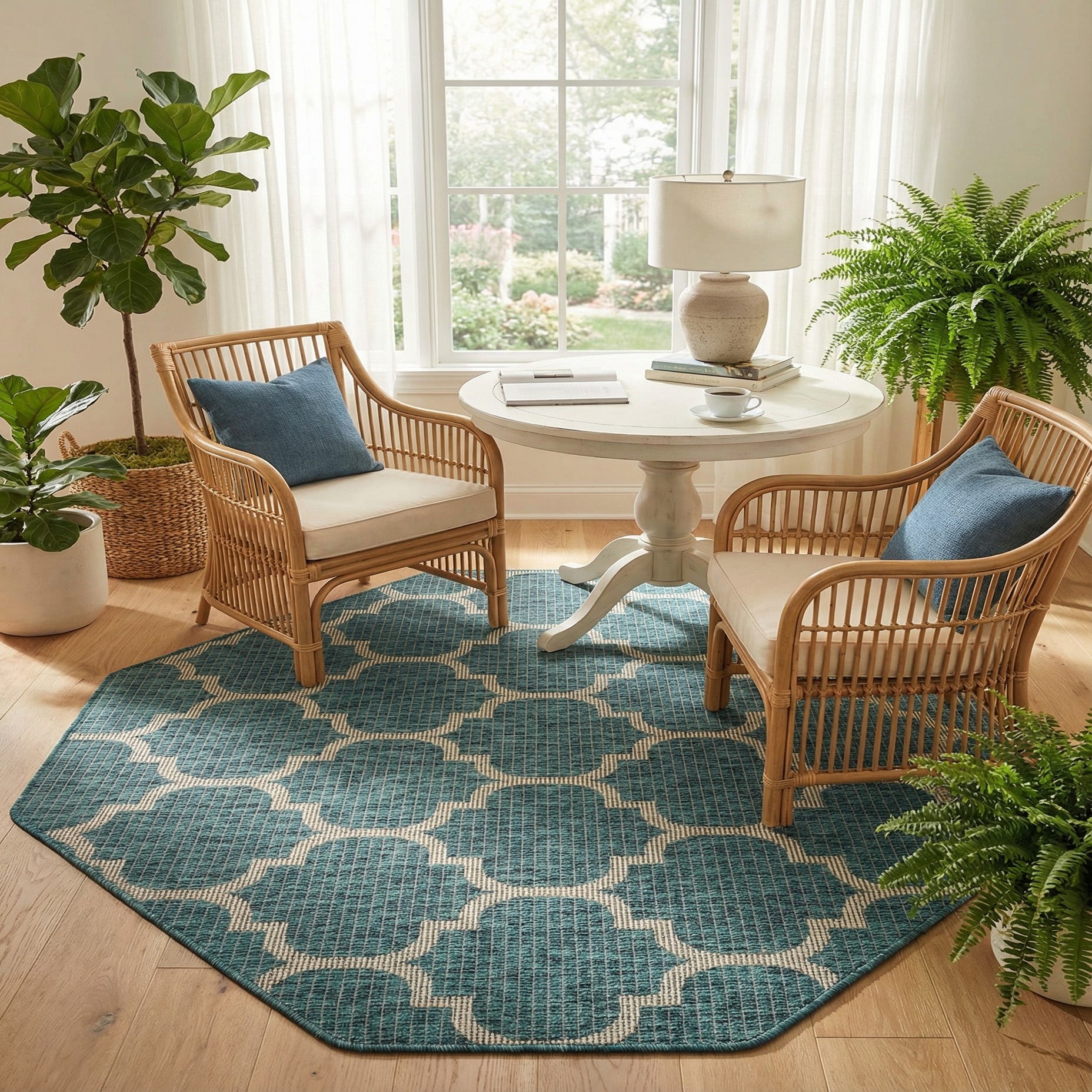 The octagonal shape draws attention to entryways, covered patios, or seating areas, and lays in nicely beneath a round bistro table or a compact outdoor lounge set. Pair it with neutral wicker or gray metal furniture and natural wood accents for a coastal or contemporary patio, or use it to introduce color to a sunroom or mudroom without overpowering layered decor.