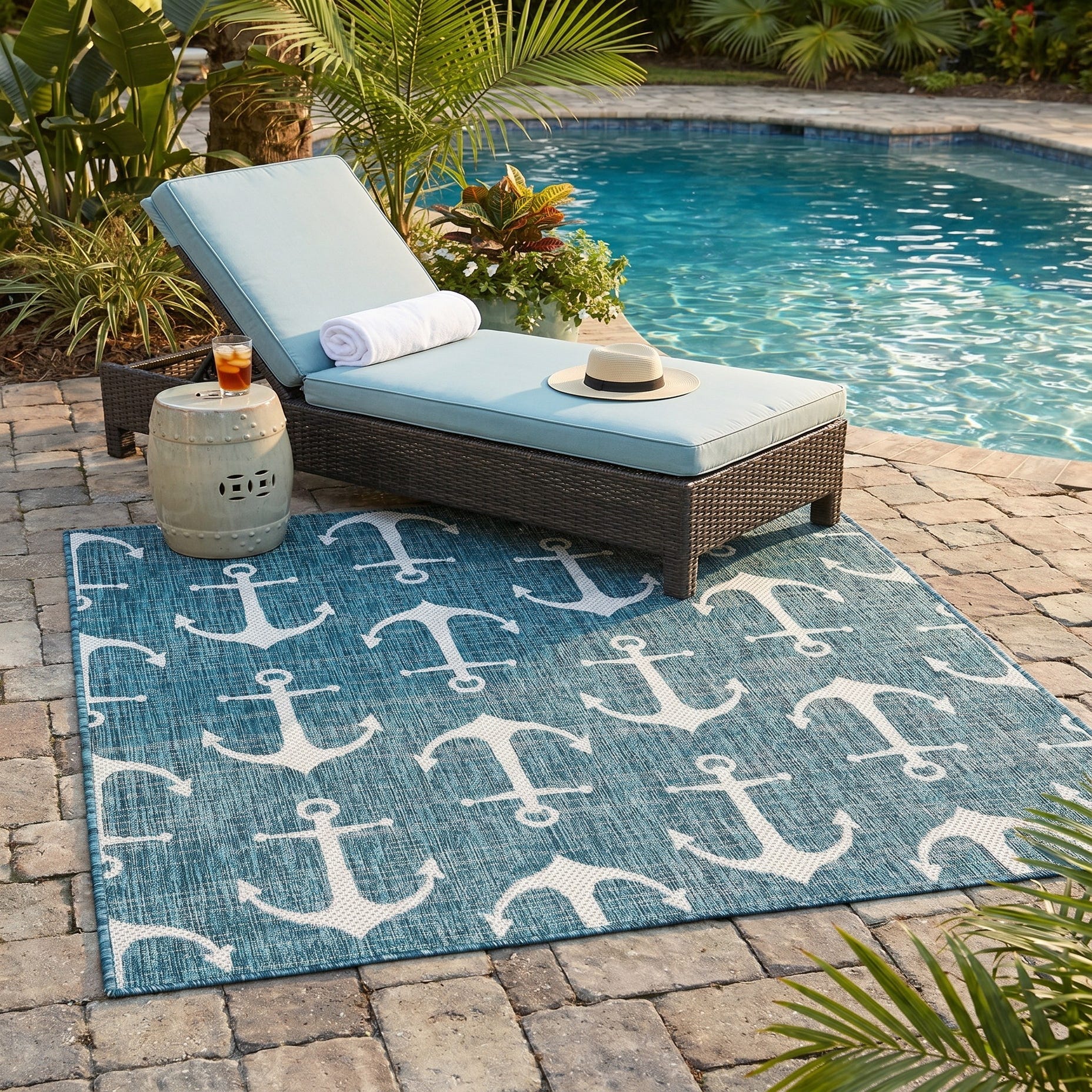 I purchase this rug for my deck at my pool. This Soft comfortable woven rug is Great even OUTSIDE after a storm. I was impressed at the rigidness of the beautiful outdoor rug.Complete accent for my project at the new deck around my pool/ I combined the runner with this round to fit the exact area that was needed for a New Look but the beauty is out performed by the Softness of this rug at my SHOELESS feet friendly Deck. My Friends have already as where I got this Jem and I am Happy to tell them Rugs.com is My New Best Resource for outdoor Comfort.
