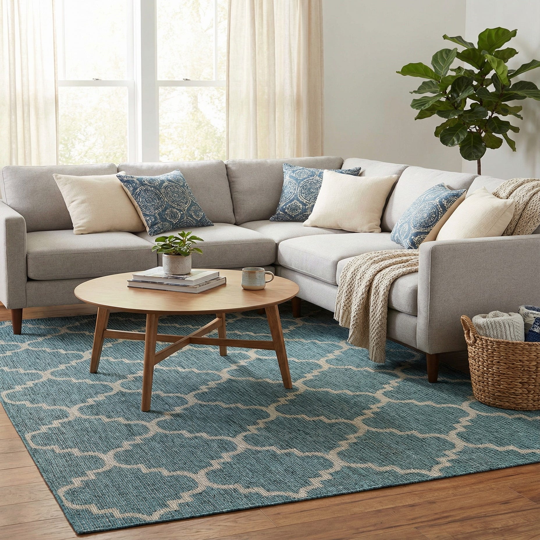 Machine-made of 100% polypropylene, the rug has a flat, slightly textured finish that works well where you want color and pattern with minimal fuss. It’s a good fit for covered patios, sunrooms, or kitchens where a durable, decorative layer is needed, and it also brings a fresh coastal or contemporary accent to living rooms and entryways. Pair it with light wood furniture and soft neutrals to let the teal pop, or layer under a streamlined metal bistro set to tie a modern outdoor seating area together.