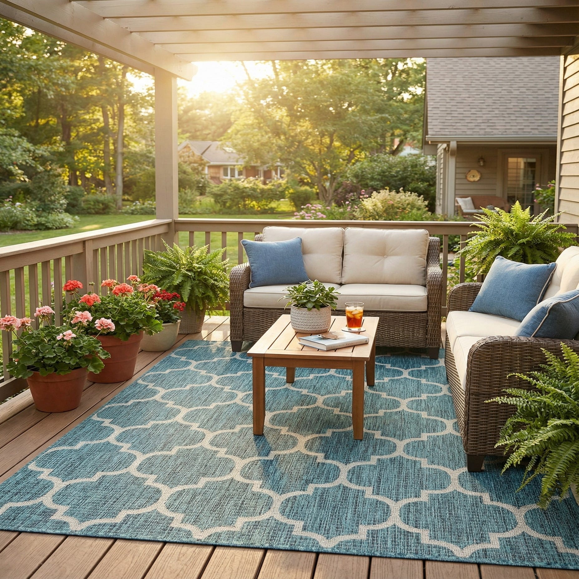 A 5x7 rectangular indoor/outdoor rug featuring a modern lattice pattern in teal blue and light beige, suitable for a patio.
