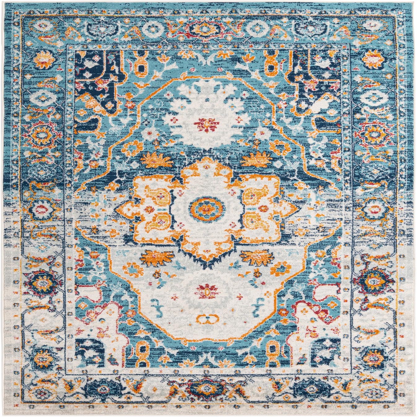 Primary color is Teal. Colors in this rug include: Teal, Blue, Gray, Ivory, Navy Blue, Red, Orange.
