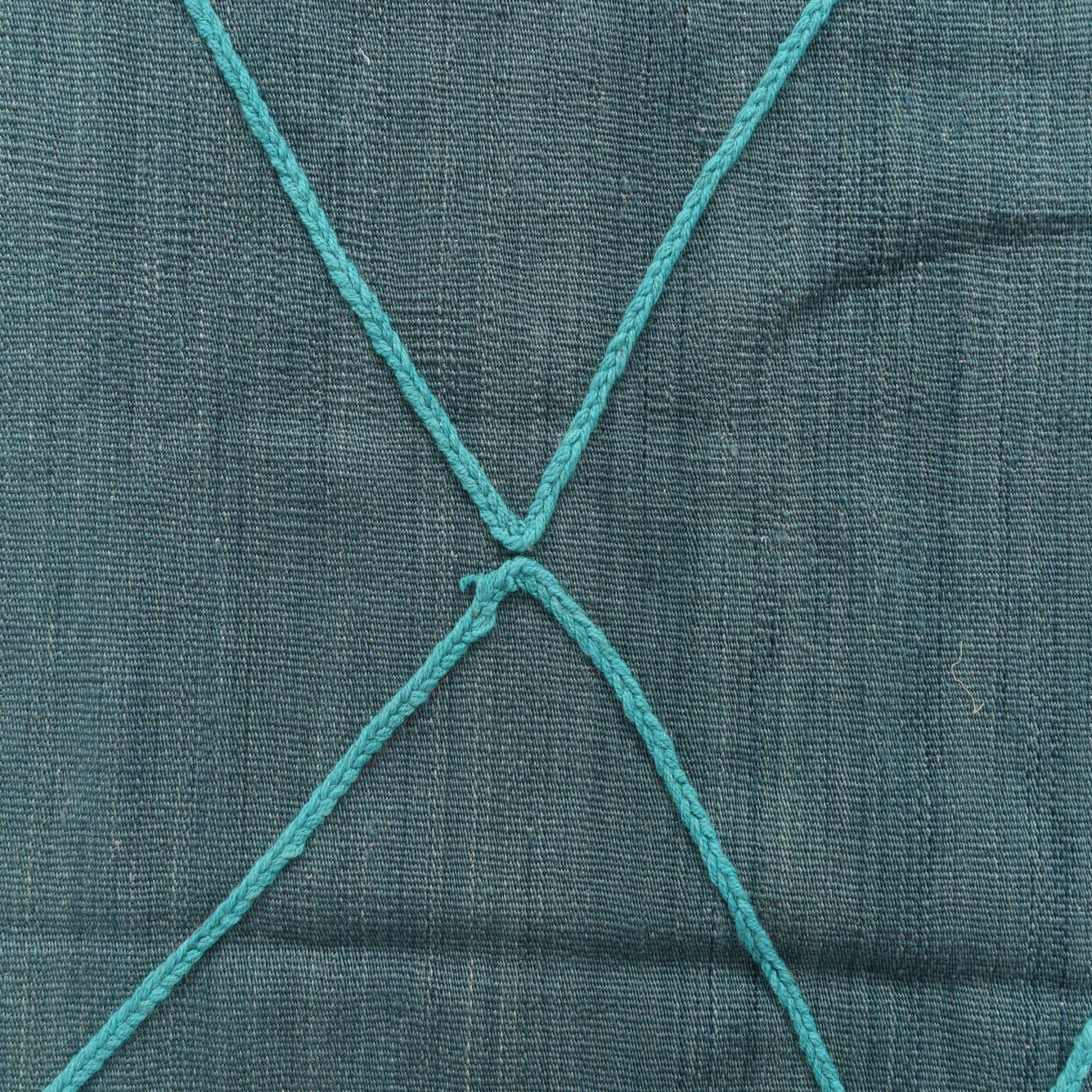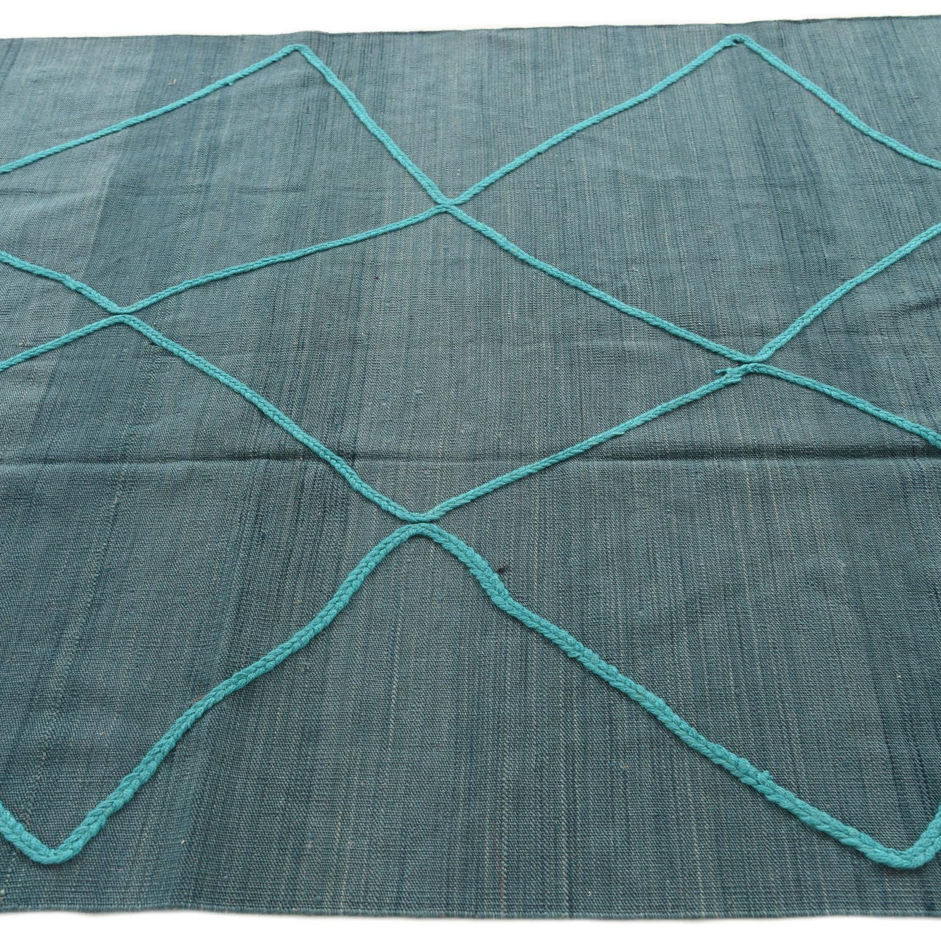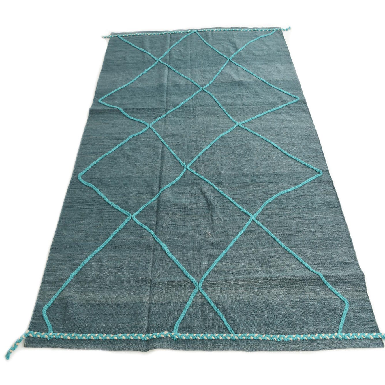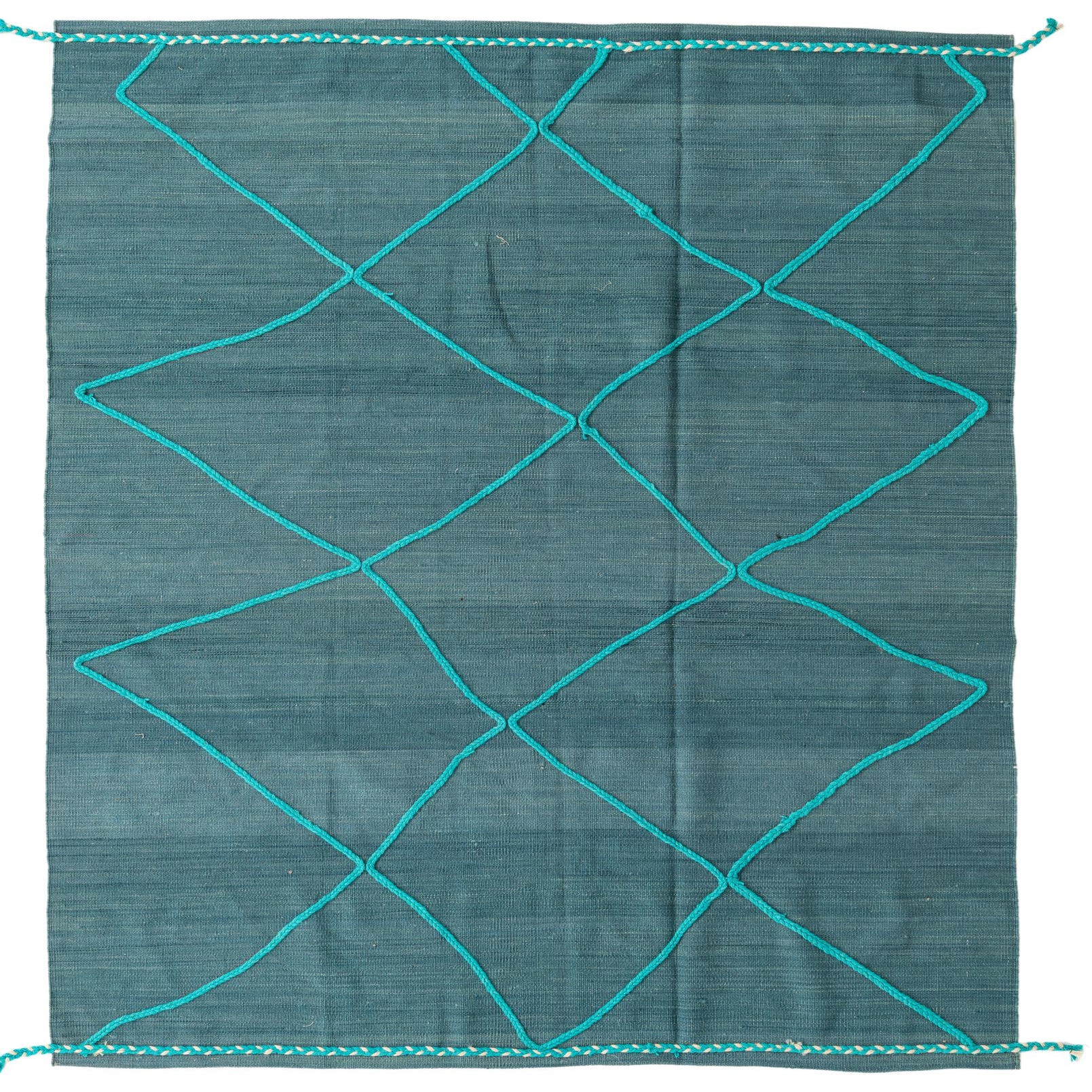 With its woolen construction, this rug offers a soft texture that contributes to a cozy and inviting atmosphere. The intense yet soothing teal palette makes this piece versatile enough to integrate into various decor styles, from the modern and minimalist to the more traditional or bohemian spaces. Its geometric pattern aligns with contemporary trends, while the handmade character adds an artisanal quality that can enrich any room.