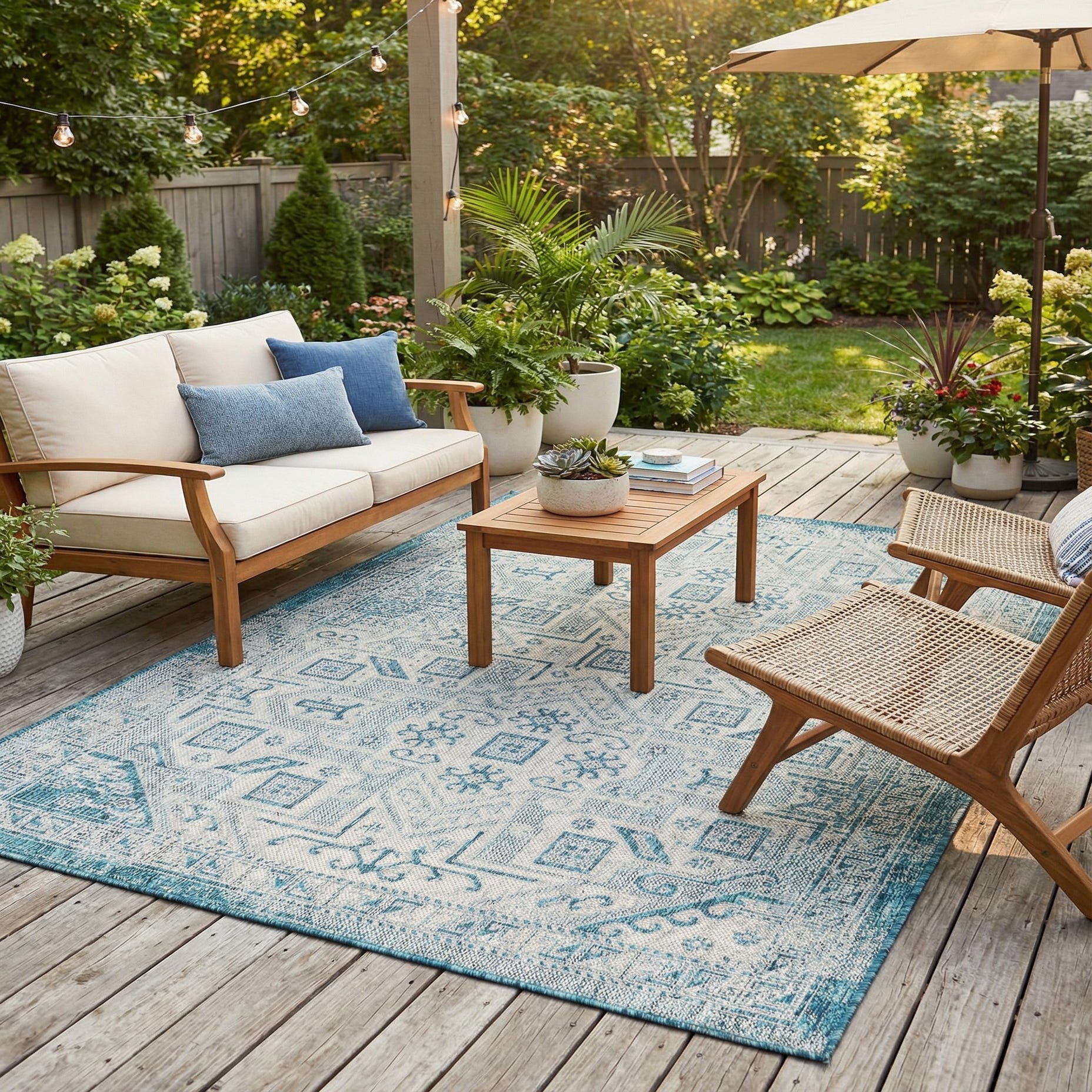 A 5x8 rectangular blue and white flatweave rug with a traditional tribal pattern, suitable for indoor or outdoor use.