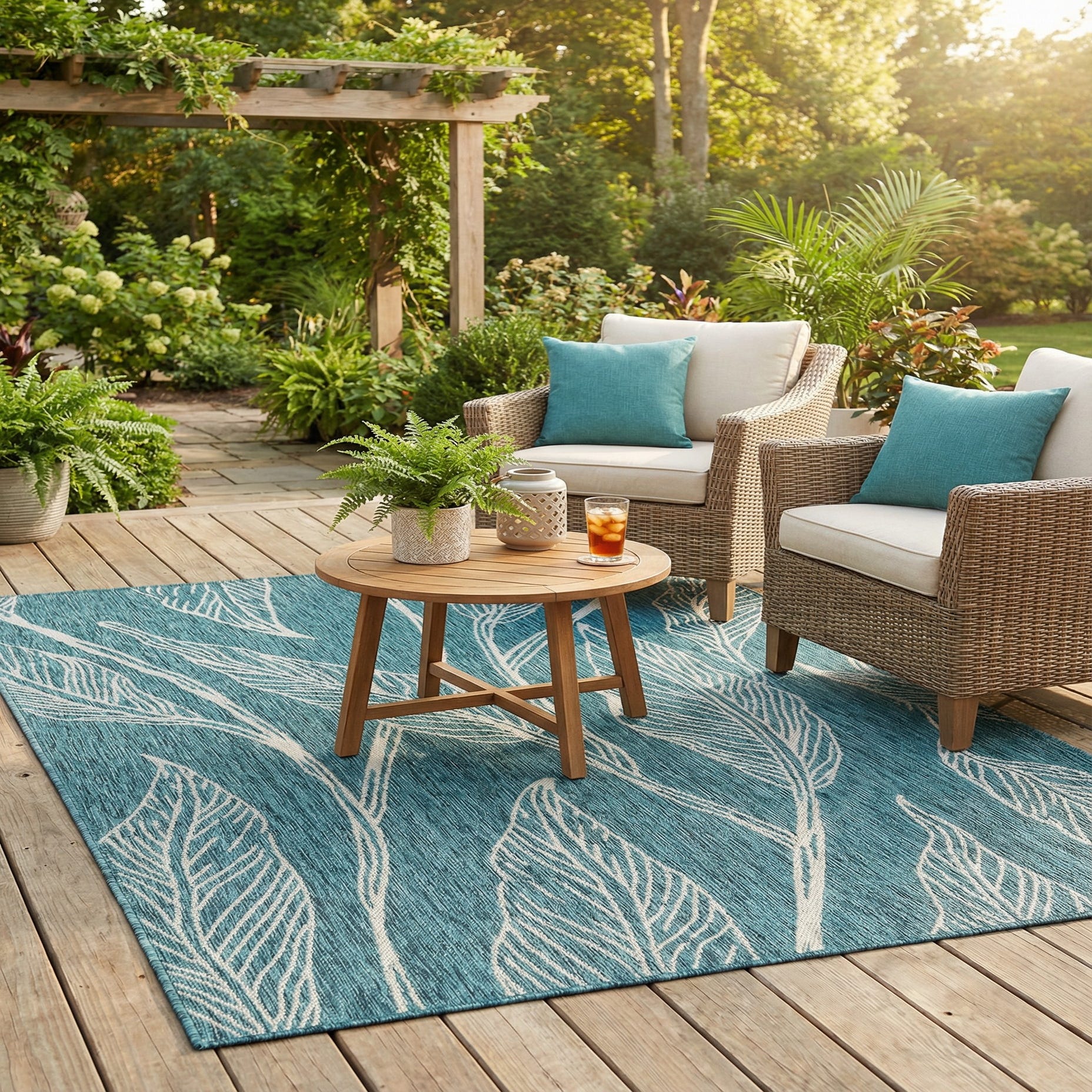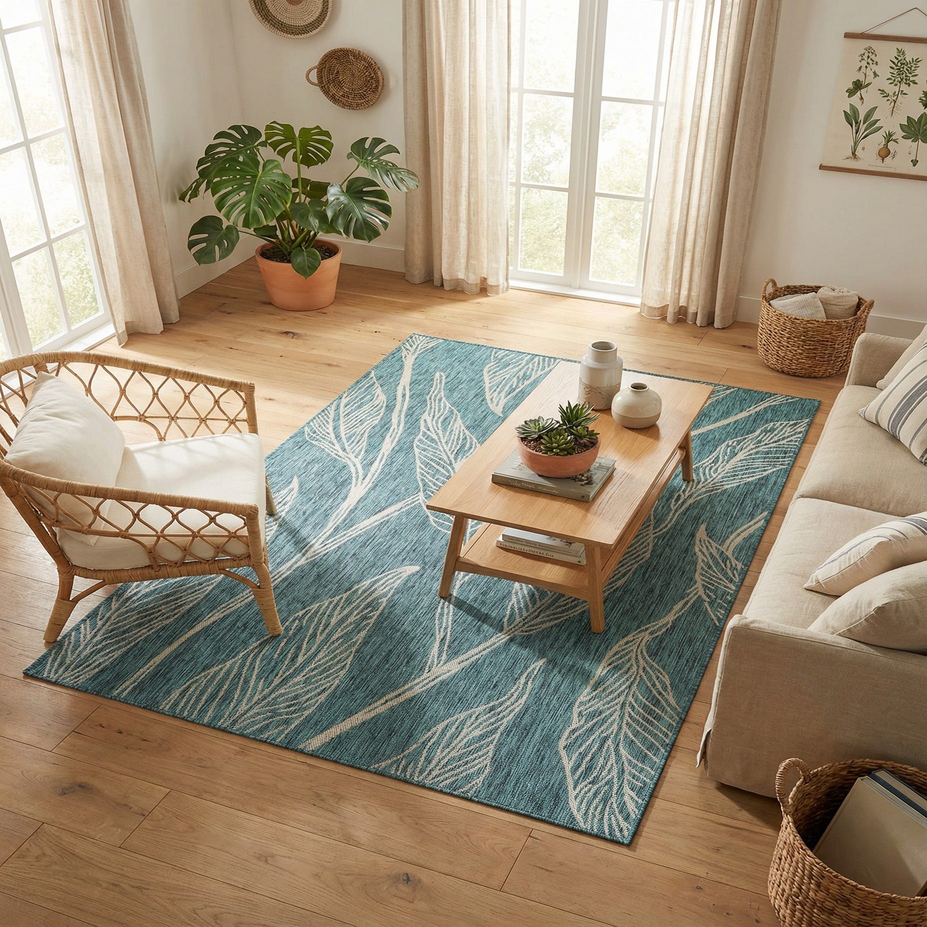 Machine-made from 100% polypropylene, this rug works well in both casual and more tailored settings. Place it beneath a dining table on a covered patio or in a sunroom paired with rattan seating and linen cushions for a relaxed, coastal-inspired vibe, or use it in a living room with clean-lined furniture and warm wood tones for a modern botanical accent. It also complements contemporary terraces, enclosed porches, and urban apartments where a pop of teal and botanical energy will anchor the space.