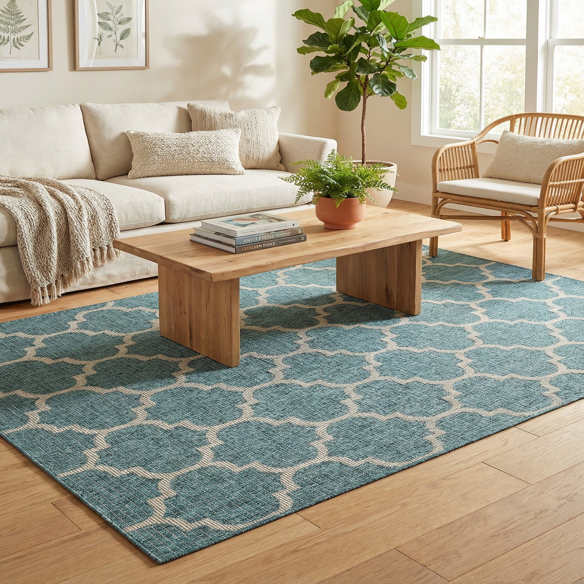 A 5x8 rectangular indoor/outdoor rug featuring a teal background with a repeating white trellis pattern, suitable for a patio or living room.