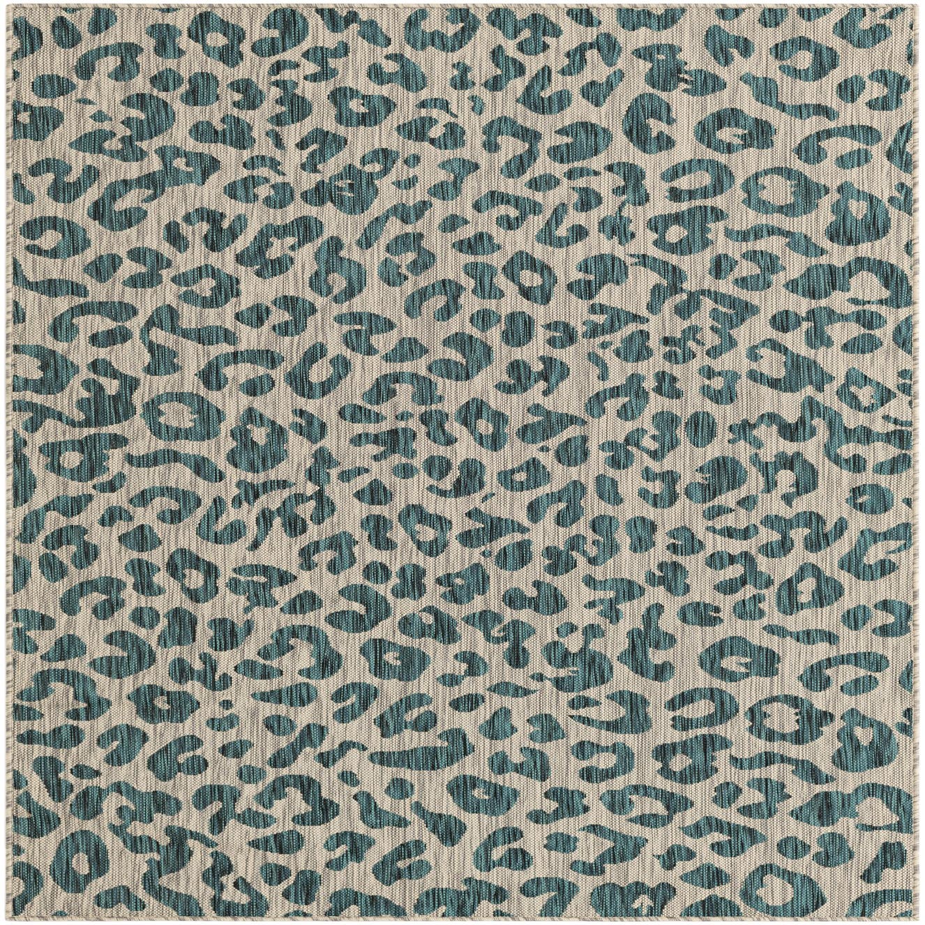 A 5x8 rectangular indoor/outdoor rug with a modern blue and green leopard print pattern on a light beige background.