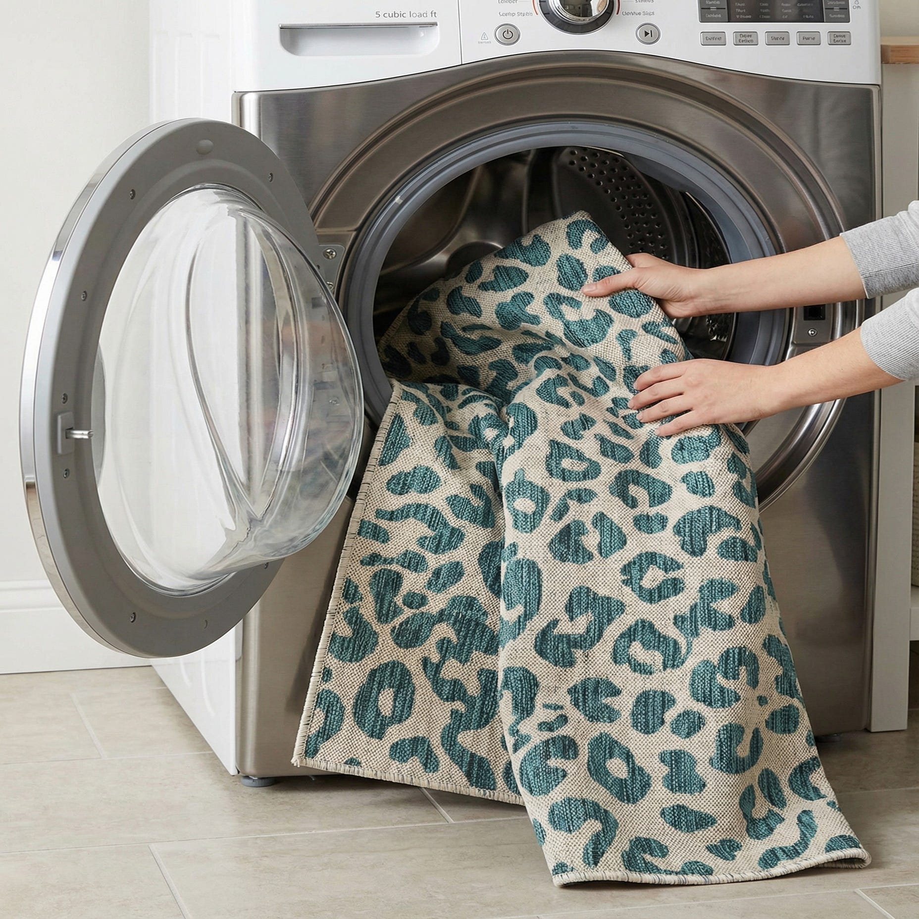 A bold, animal-inspired pattern gives this rug a modern safari look with a playful edge. Teal forms the ground while irregular ivory and gray spots create a loose leopard motif across the surface. Machine made from 100% polypropylene, the rug has a low-profile, flatwoven feel with subtle ribbing that you can notice under your fingertips—textured enough to add visual interest while remaining smooth to walk across.