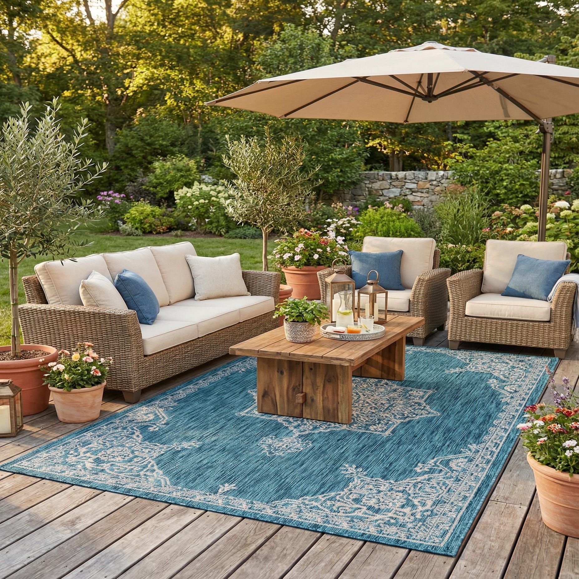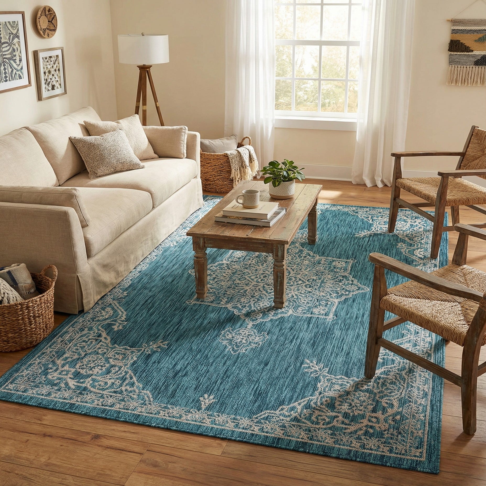 This rug works well on a covered patio or sunroom where the teal enlivens outdoor seating, and it also anchors a living or dining area with coastal, transitional, or cottage-inspired decor. Pair it with rattan or painted wood furniture, white trim and linens, or weathered gray finishes to highlight the ivory and gray details while maintaining a relaxed, cohesive scheme.