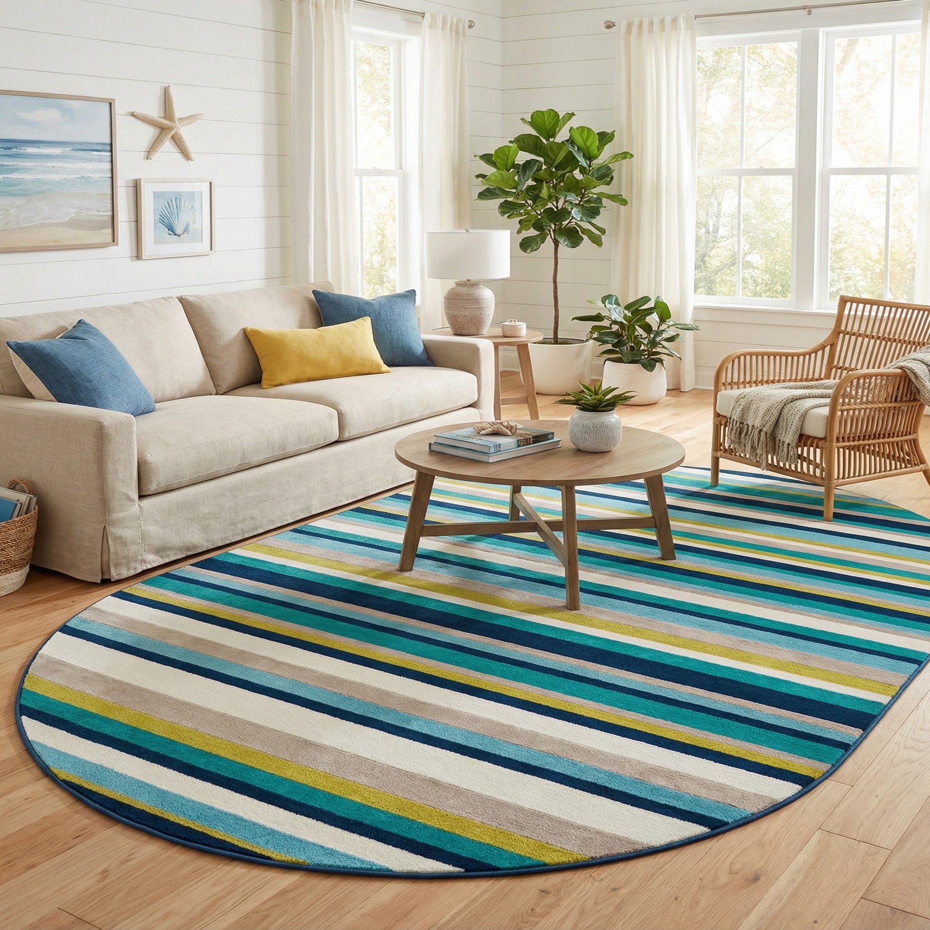 The oval shape softens angular furniture and works particularly well beneath a round dining table, in an entry or foyer, or layered in a coastal or transitional living room. Pair it with white or navy upholstery and light wood tones for a breezy, pulled-together look, or add textured linens and woven baskets to enhance the casual, contemporary feel. The durable polypropylene construction makes it suited for everyday spaces like family rooms, play areas, or high-traffic hallways.