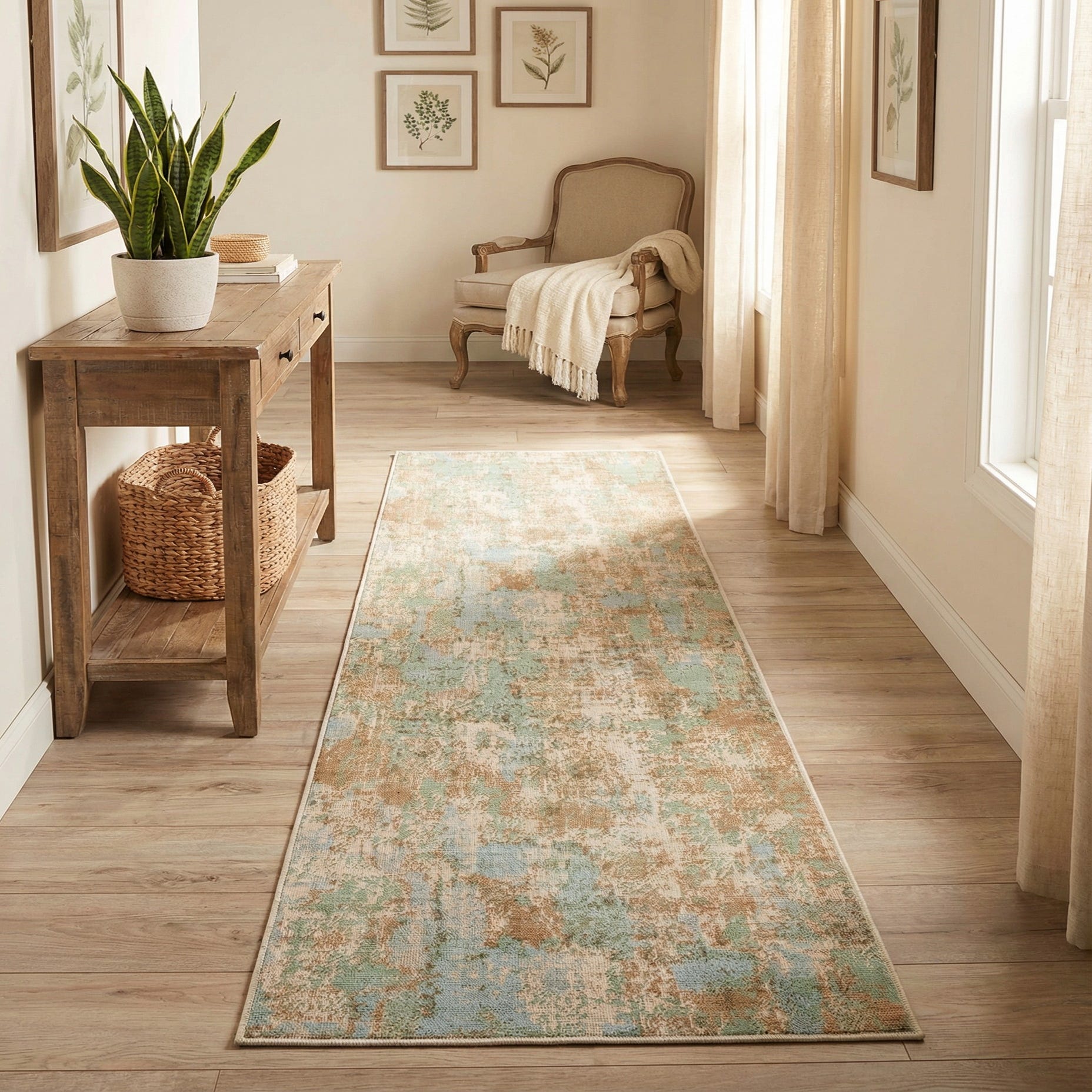 This runner works well in a bright hallway or entry where you want color without a bold pattern, and it complements coastal, transitional, or contemporary interiors. Place it beside a bed to add a calming color layer, line it along a kitchen or gallery-style corridor, or use it under a narrow console table paired with natural wood, linen upholstery and soft metallic accents for a cohesive, relaxed look.
