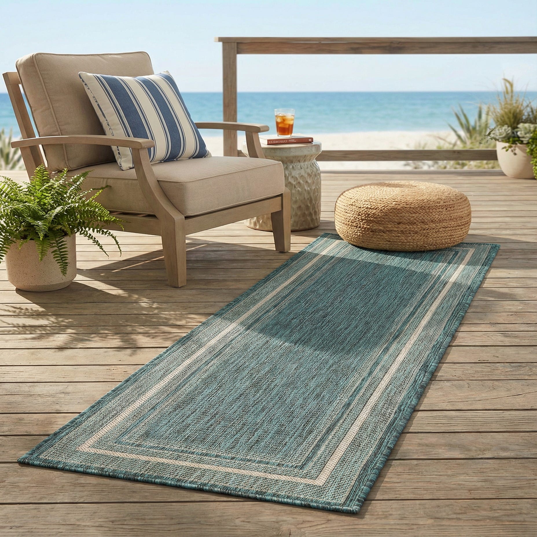 A border-style runner woven in a teal ground, this design pairs a finely textured central field of tight, striated weave with clean, linear bands in beige and gray that frame the edges. The pattern is straightforward and modern — a subtle mix of horizontal and vertical threads creates visual depth without raised pile. Machine-made from 100% polypropylene, the rug has a low-profile, flat-woven feel underfoot with a slightly firm texture typical of outdoor construction.