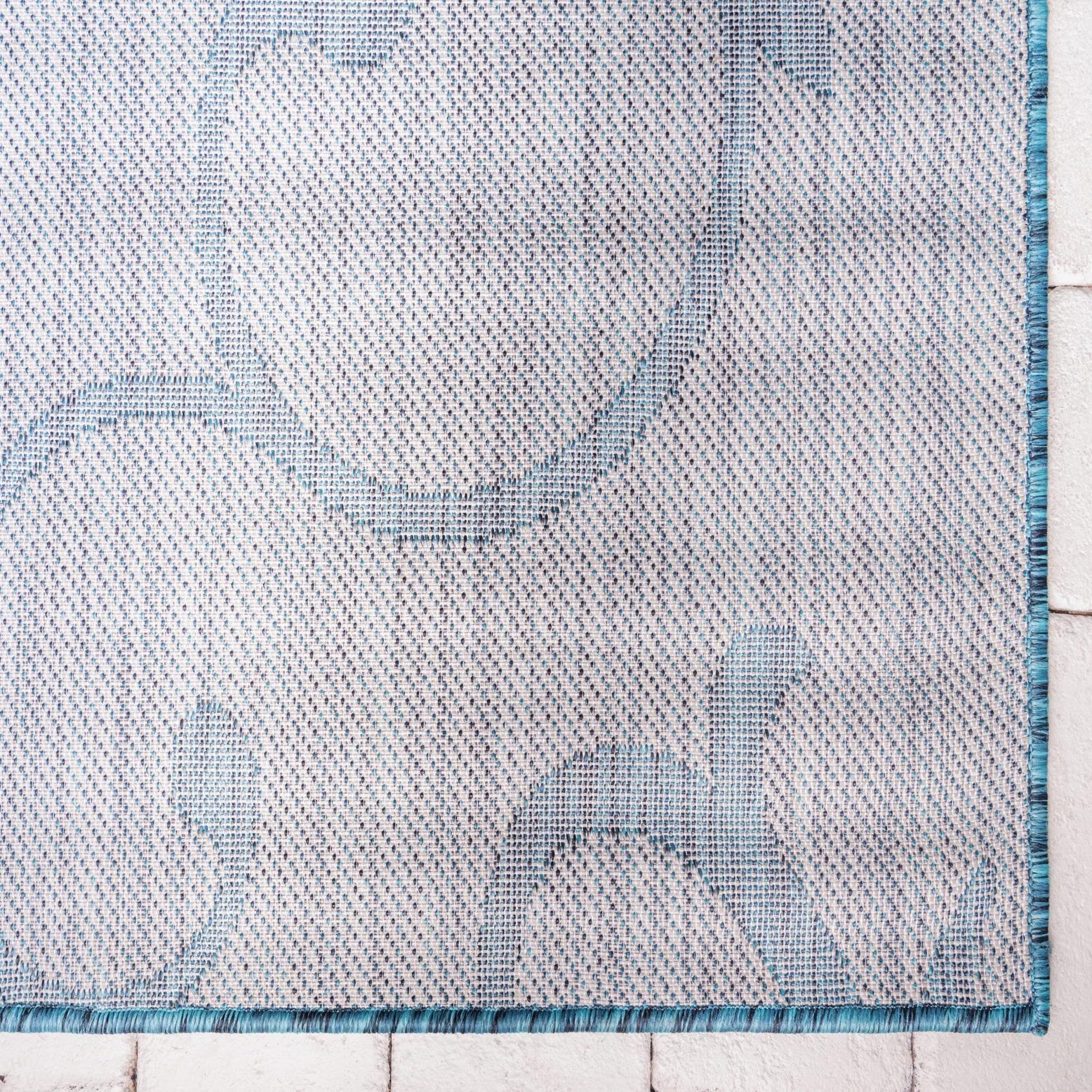 This runner works well in a variety of spaces: place it along a hallway or entry to introduce color and pattern without overpowering the space, layer it in a sunroom or covered patio for an easy-care pop of style, or use it in a kitchen or narrow corridor to tie together teal, gray, and neutral accents. It complements coastal, modern farmhouse, and transitional interiors where a mix of pattern and clean lines is desired.