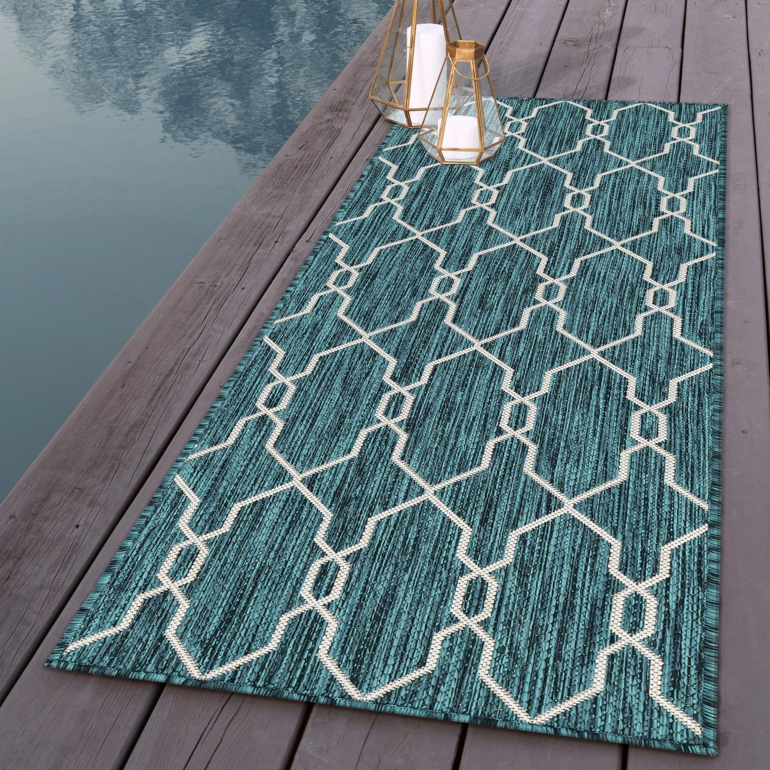The Outdoor Lattice collection presents a 6-foot runner rug, machine-woven from 100% polypropylene, designed to offer both durability and style. This rug features a teal background with a contrasting ivory lattice pattern, contributing a vibrant and modern look to any space. The flatweave construction not only lends itself to a sleek profile but also ensures a texture that can withstand high-traffic areas while maintaining its appearance.