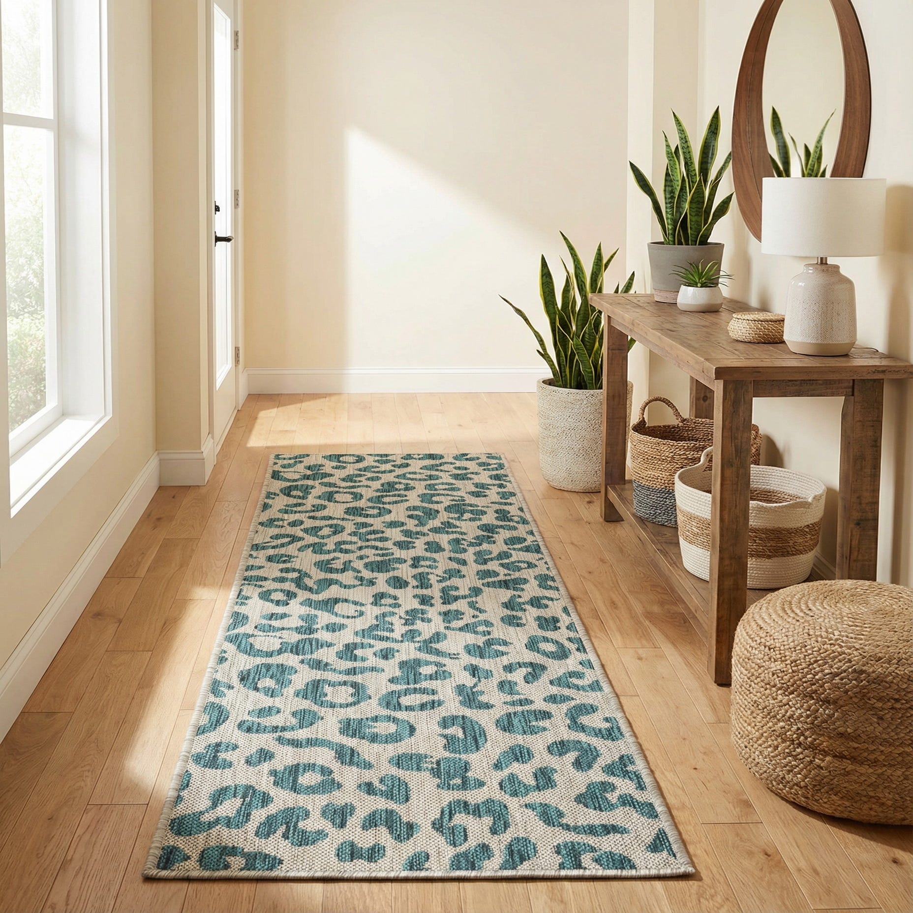 This runner fits well in narrow, active spaces: place it in a hallway, entry, sunroom, or covered patio to add pattern and color without overpowering the room. It pairs naturally with natural woods and rattan for a casual, coastal-meets-boho look, and it also complements modern or eclectic interiors when layered with neutral sofas, gray upholstery, or crisp white trim. Use teal or ivory accent pillows and accessories to tie the scheme together and let the pattern become a focal that still reads effortless.