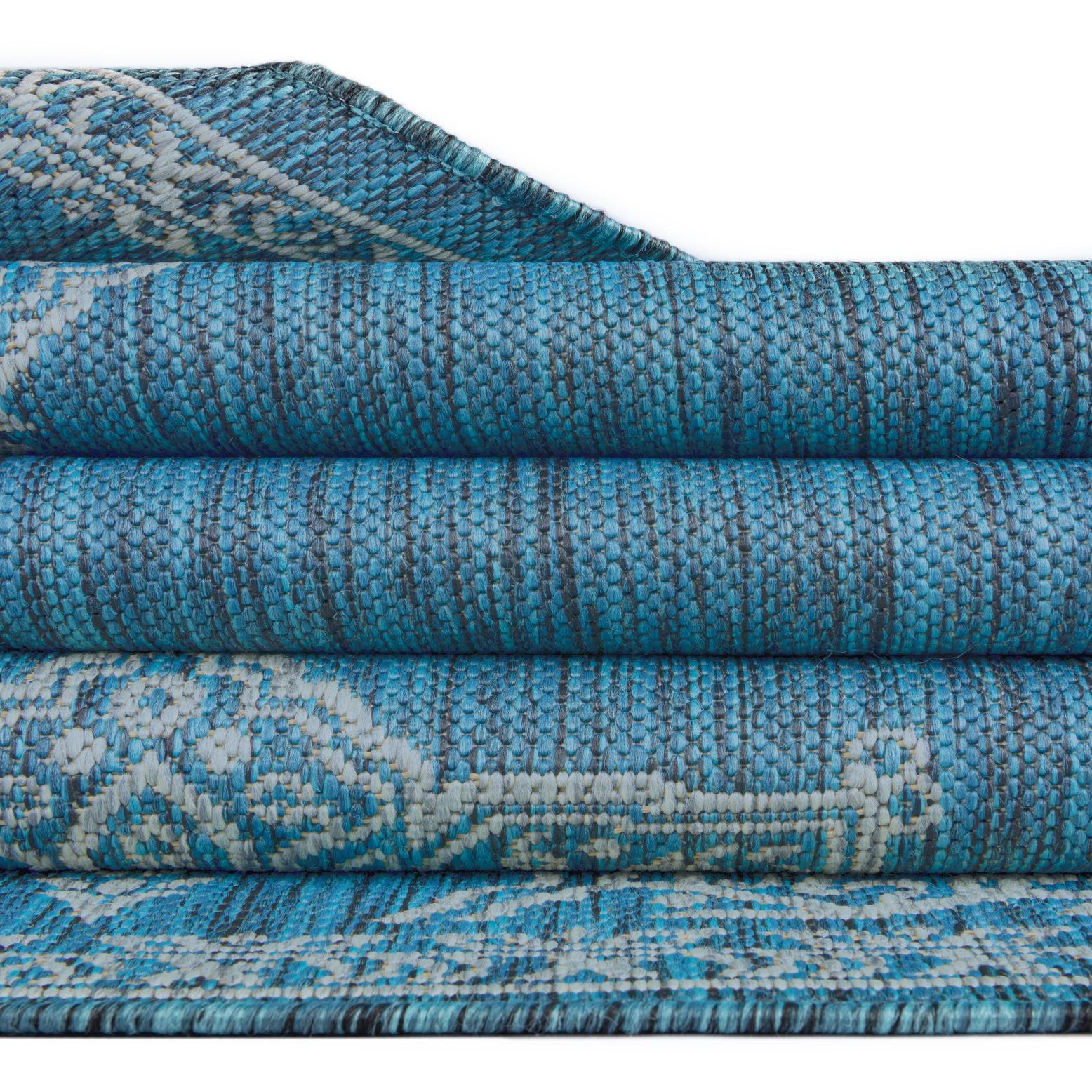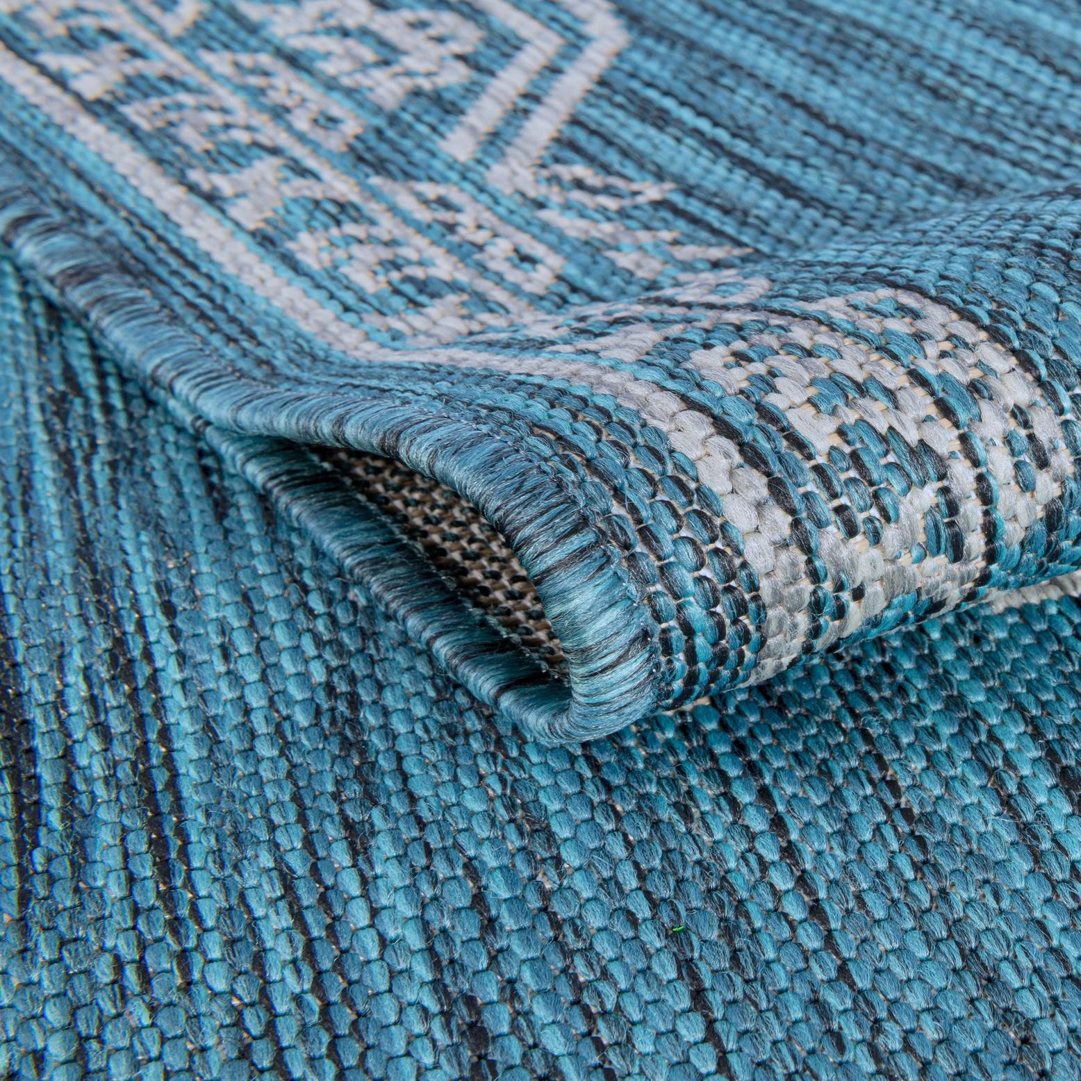A 6 ft runner rug in shades of blue and green, featuring a white traditional medallion pattern, ideal for a hallway or patio.