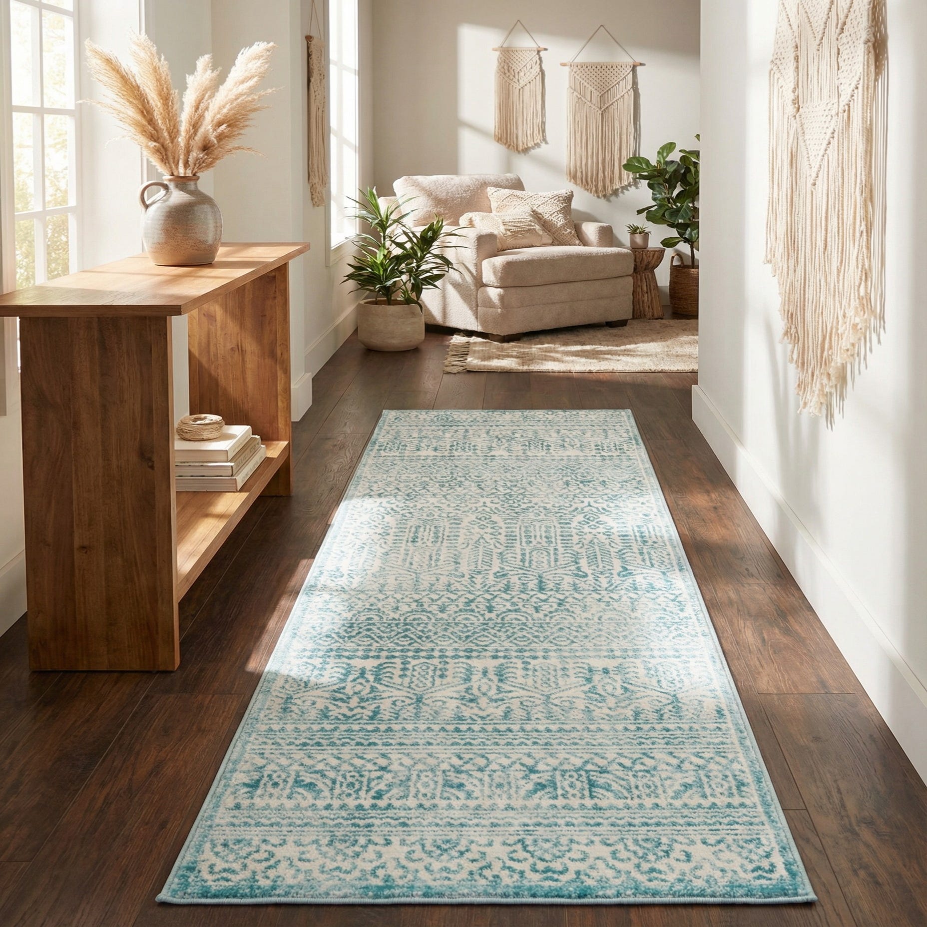 This runner works well in hallways and entryways to add color without overwhelming a narrow space, and it pairs naturally with light wood floors, white or sand-toned furnishings, and woven or rattan accents for a coastal or cottage-inspired vibe. It also complements transitional and modern farmhouse settings—place it in front of a kitchen island or alongside a bed to introduce pattern and cool color while keeping the room feeling fresh and relaxed.