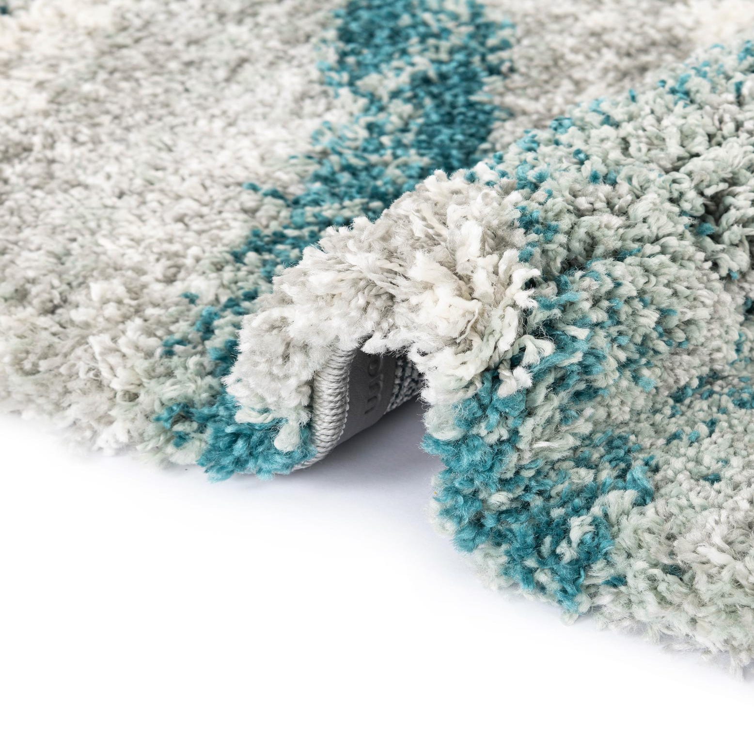 A 6x9 rectangular shag rug with a modern abstract pattern in shades of blue, green, and white.