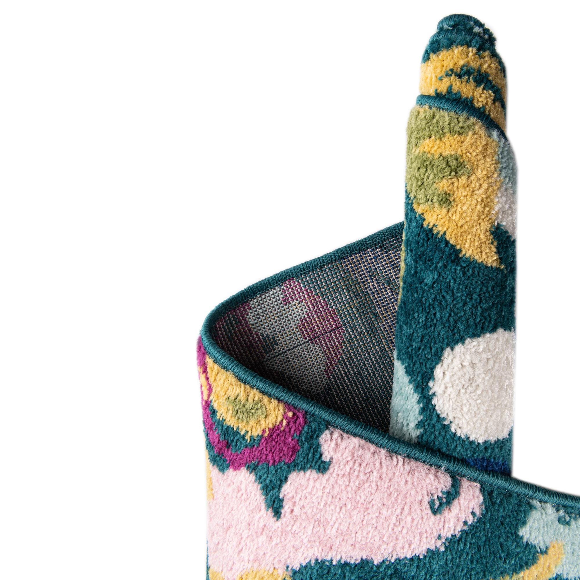 A painterly floral pattern blooms across a rich teal background, with leafy accents and oversized blossoms rendered in green, ivory, light blue, purple, yellow, pink and navy blue. The octagonal shape gives the design a modern twist on a classic motif, and the machine-made construction in 100% polypropylene produces a low, even pile that feels soft underfoot while keeping the surface tidy and consistent. Brushstroke-style florals and layered foliage create movement and depth, so the rug reads as both lively and composed.