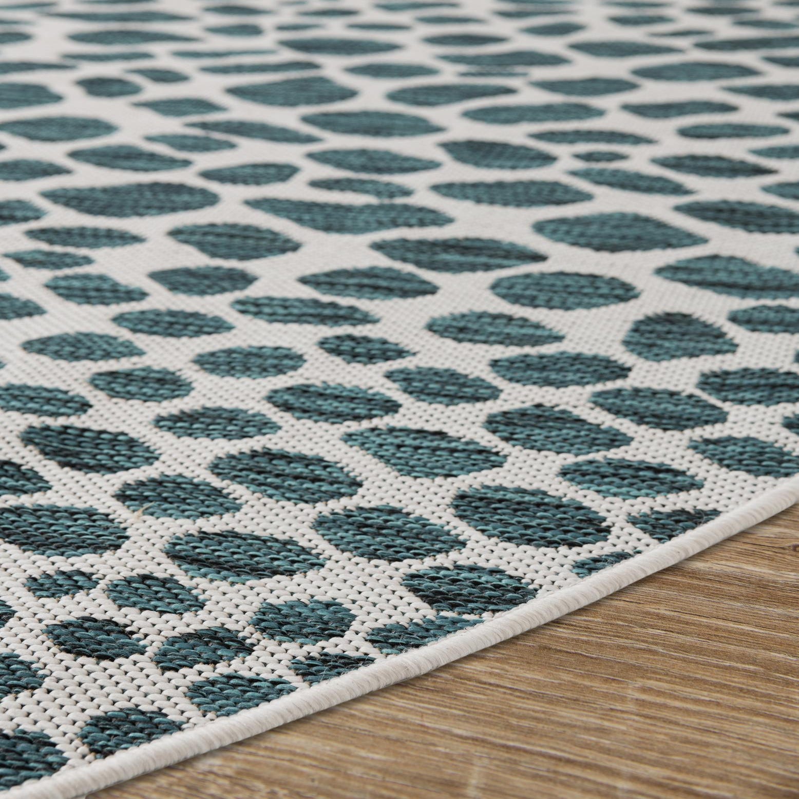 A round outdoor rug with a bold teal field and an organic pebble-dot pattern in ivory. The irregular, clustered motifs form a lively, radial texture across the surface that brings movement without a formal border. Machine made from 100% polypropylene, the weave sits low to the floor and has a slightly textured, tightly woven hand—firm underfoot with the subtle grain of outdoor yarns.