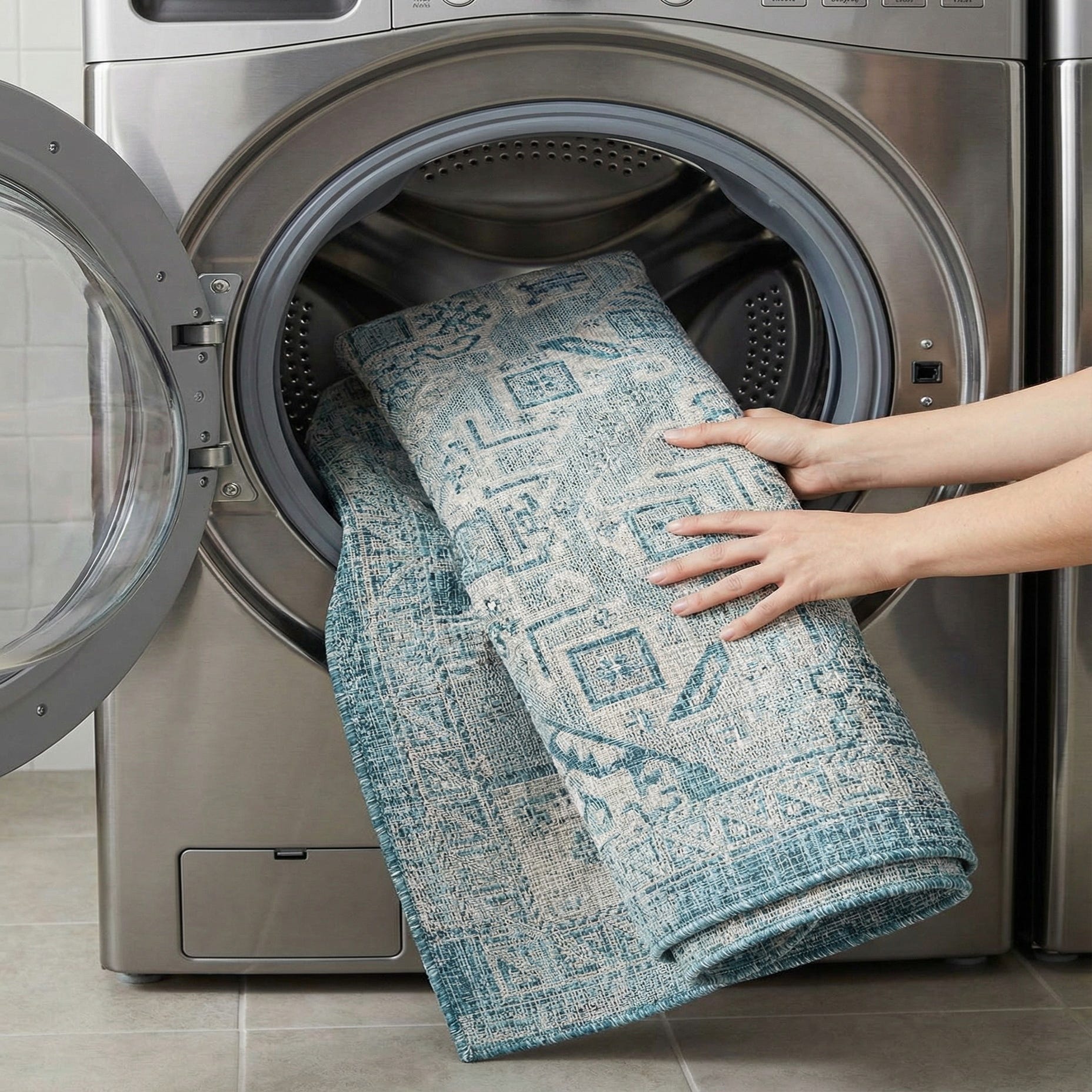 Machine-made from 100% polypropylene, the rug has a low-profile, tightly woven surface you can feel underfoot — smooth with a subtle texture where the distressed pattern overlaps the weave. The cool teal background and neutral gray and ivory accents pair nicely with light woods, rattan, and linen, as well as darker metal or leather pieces. Place it to anchor a casual living area or dining space, layer it in a sunroom or covered patio, or use it to add a graphic, coastal-leaning touch to bohemian and transitional interiors.