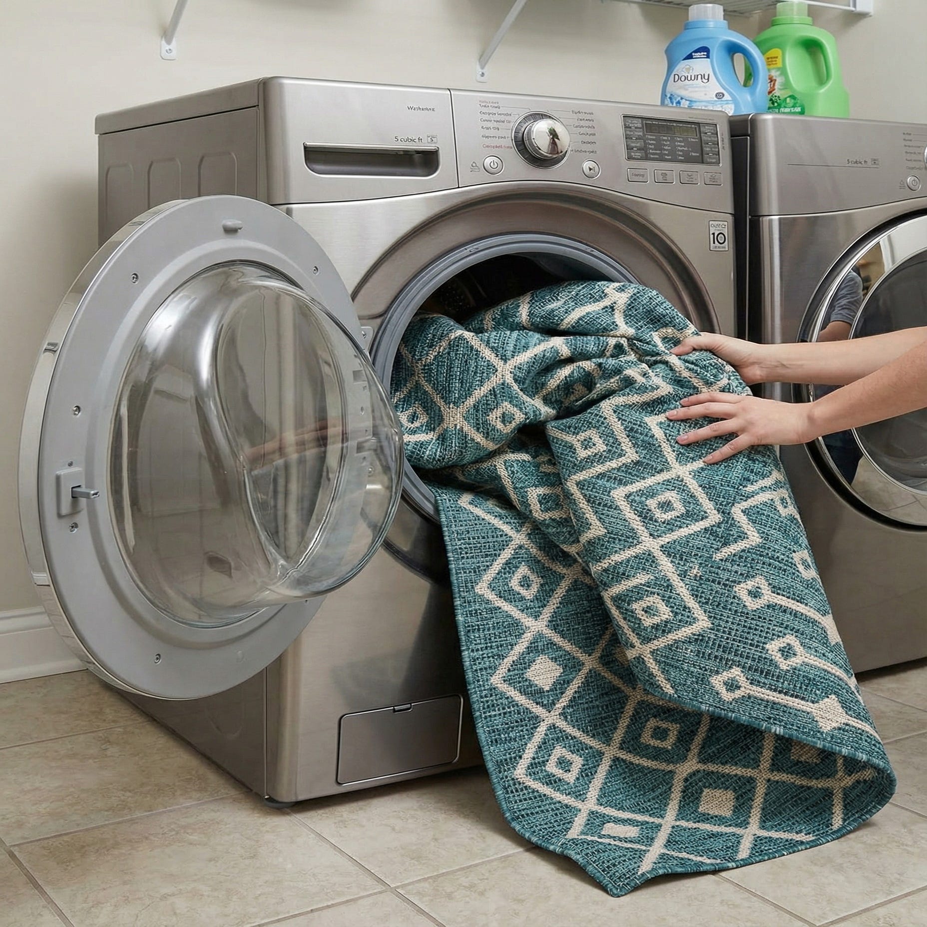 This design works well in covered outdoor spaces like a screened porch or patio, and it also translates to indoor settings — try it under a dining table, in a sunroom, or anchored beneath a casual living room seating group. The teal and ivory palette pairs nicely with coastal, modern, or transitional decor; combine it with natural wood furniture and light linens for an airy look, or layer it with darker metal accents and textured throws for a more composed, contemporary feel.