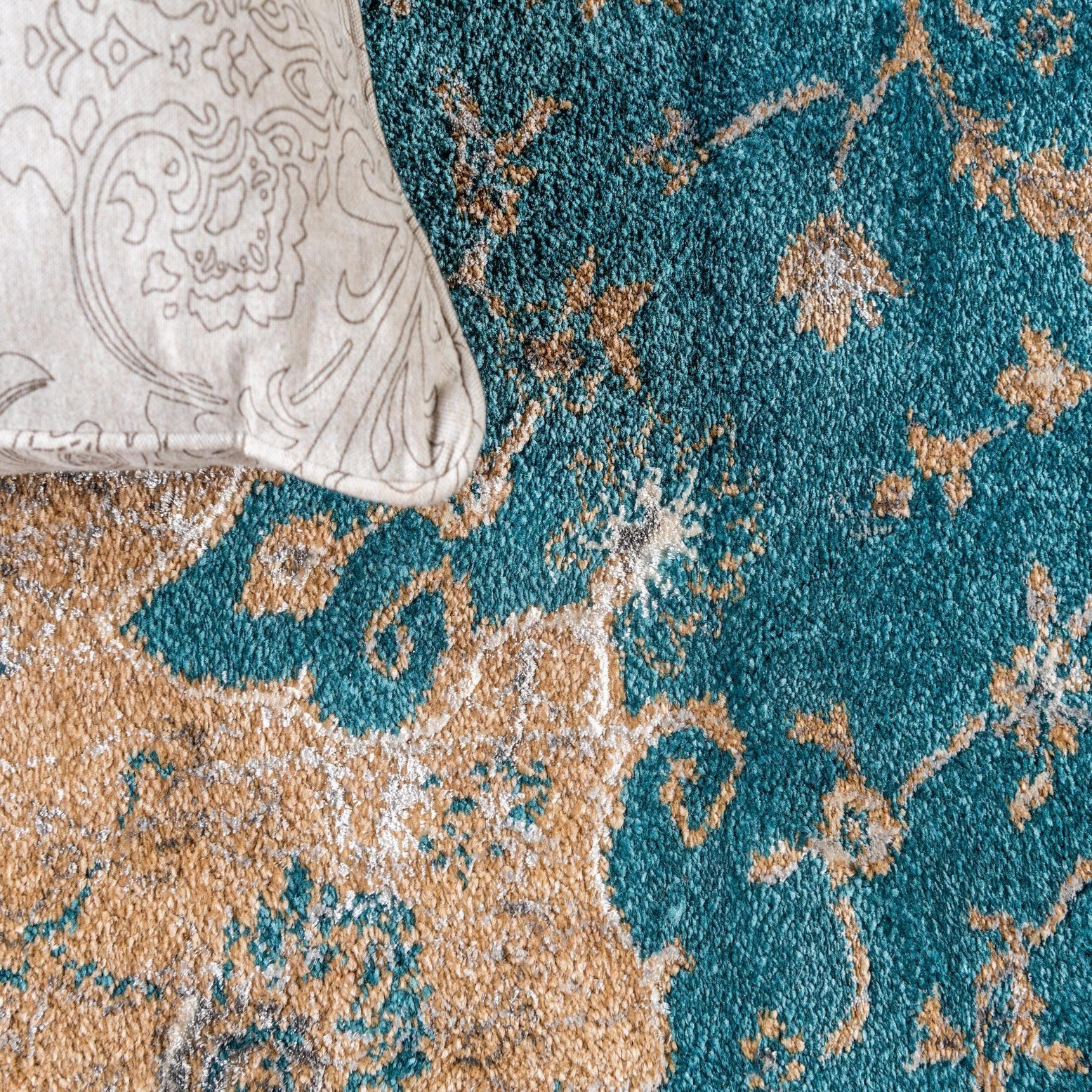 Primary color is Teal. Colors in this rug include: Teal, Blue, Gray, Light Brown.
