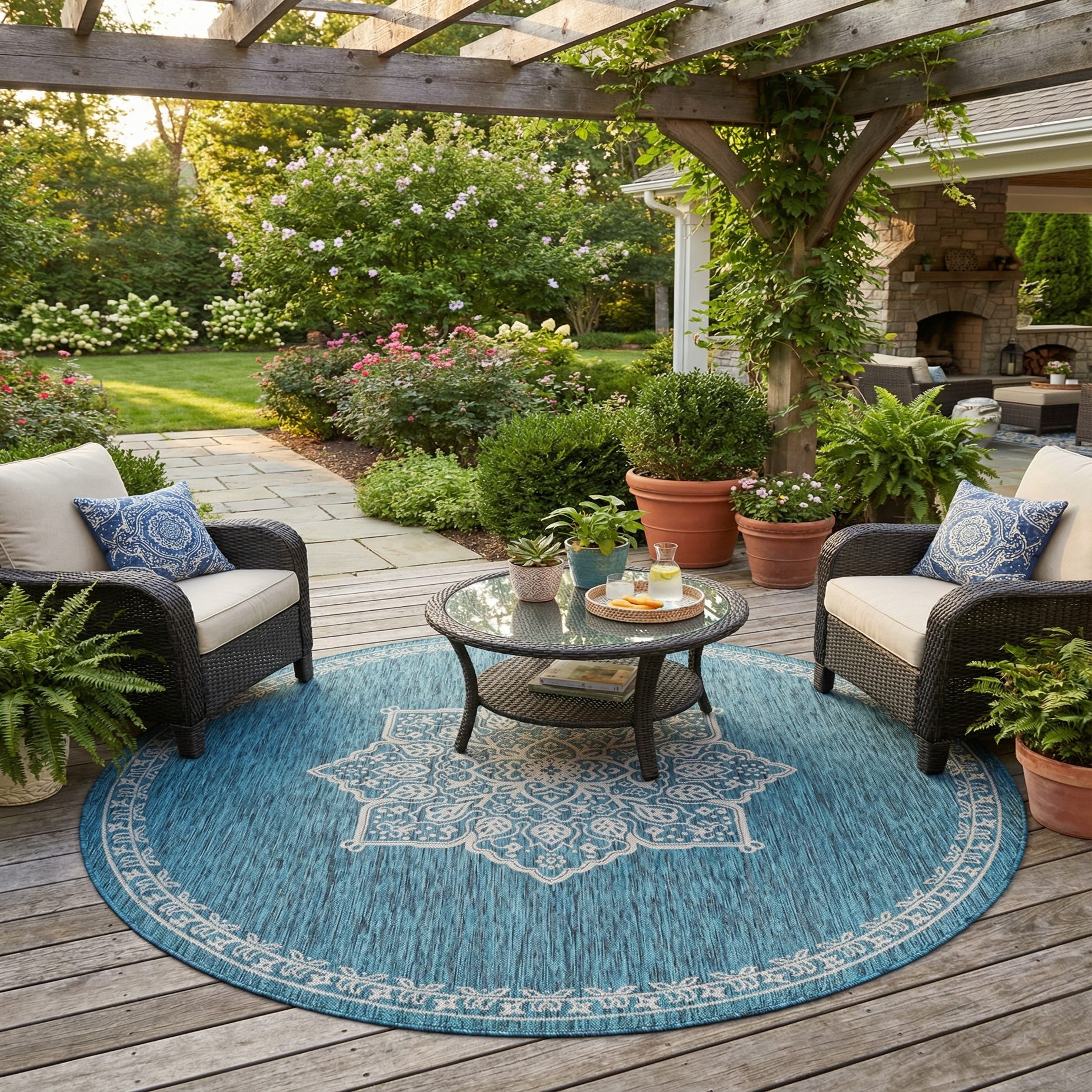 Machine made from 100% polypropylene, the rug has a low-profile, tightly woven surface that feels smooth and slightly firm underfoot. Its texture reads casual and practical while still retaining the visual warmth of a handwoven piece. Place it beneath a round bistro set on a covered patio, in a sunroom layered with natural-fiber accents, or centered under a casual living room grouping — it pairs especially well with wicker or rattan, painted wood furniture, and coastal or cottage-inspired décor.